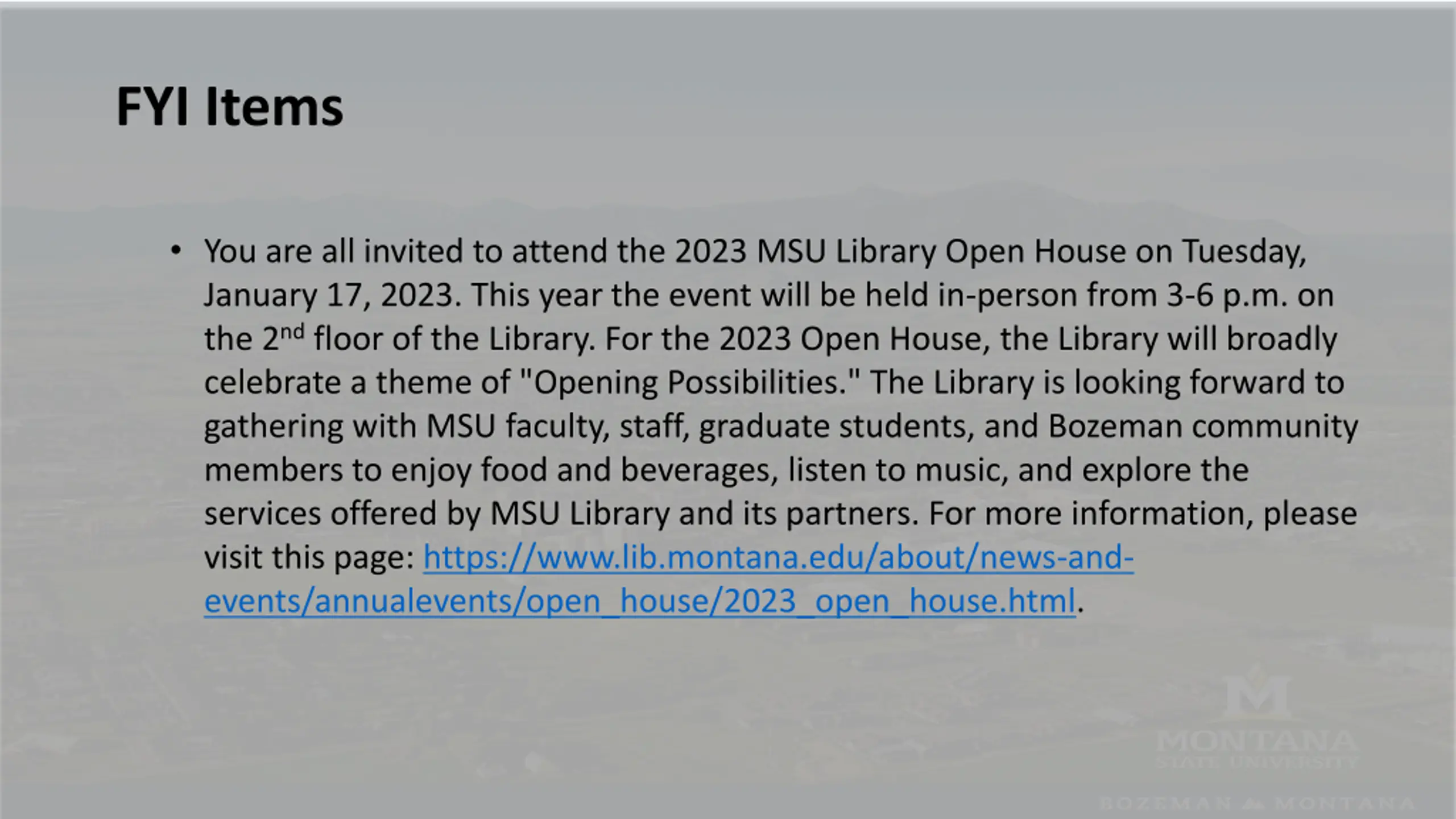 FYI Items You are all invited to attend the 2023 MSU Library Open House on Tuesday, January 17, 2023. This year the event will be held in-person from 3-6 p.m. on the 2ndfloor of the Library. For the 2023 Open House, the Library will broadly celebrate a theme of "Opening Possibilities." The Library is looking forward to gathering with MSU faculty, staff, graduate students, and Bozeman community members to enjoy food and beverages, listen to music, and explore the services offered by MSU Library and its partners. For more information, please visit this page: https://www.lib.montana.edu/about/news-and- events/annualevents/open_house/2023_open_house.html.