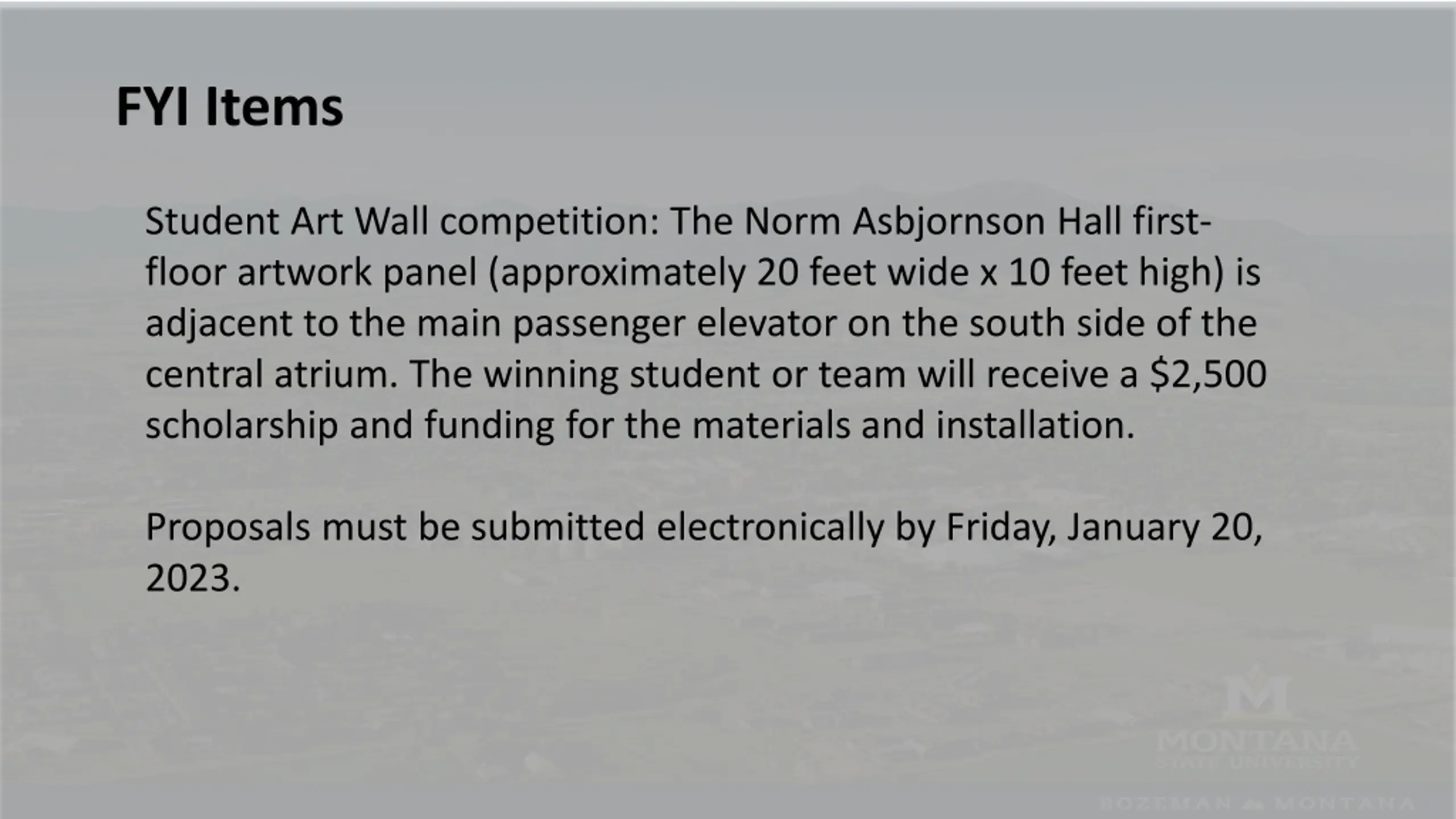 FYI Items Student Art Wall competition: The Norm Asbjornson Hall first- floor artwork panel (approximately 20 feet wide x 10 feet high) is adjacent to the main passenger elevator on the south side of the central atrium. The winning student or team will receive a $2,500 scholarship and funding for the materials and installation. Proposals must be submitted electronically by Friday, January 20, 2023.