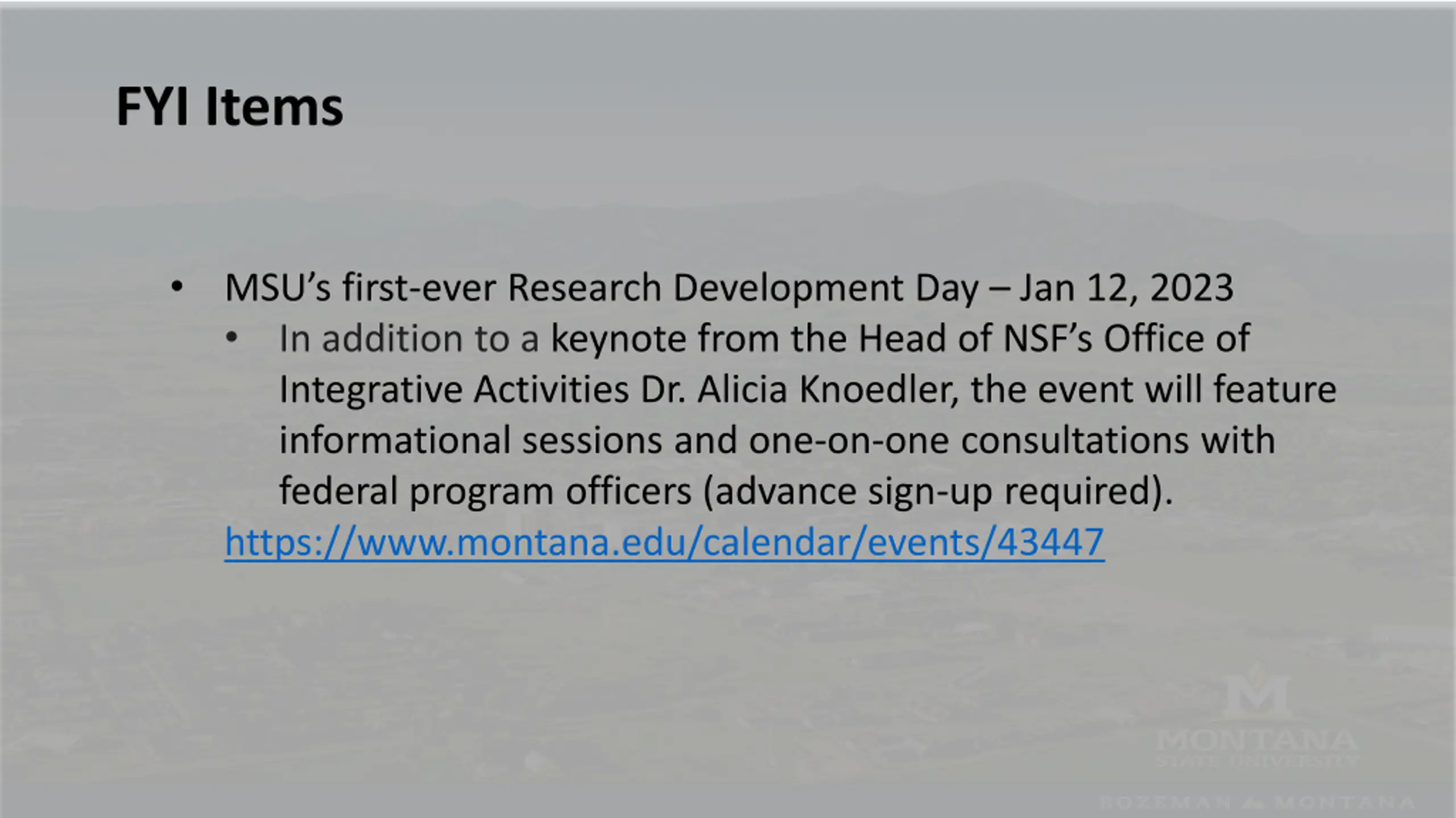 FYI Items MSU s first-ever Research Development Day Jan 12, 2023 In addition to a keynote from the Head of NSF s Office of Integrative Activities Dr. Alicia Knoedler, the event will feature informational sessions and one-on-one consultations with federal program officers (advance sign-up required). https://www.montana.edu/calendar/events/43447