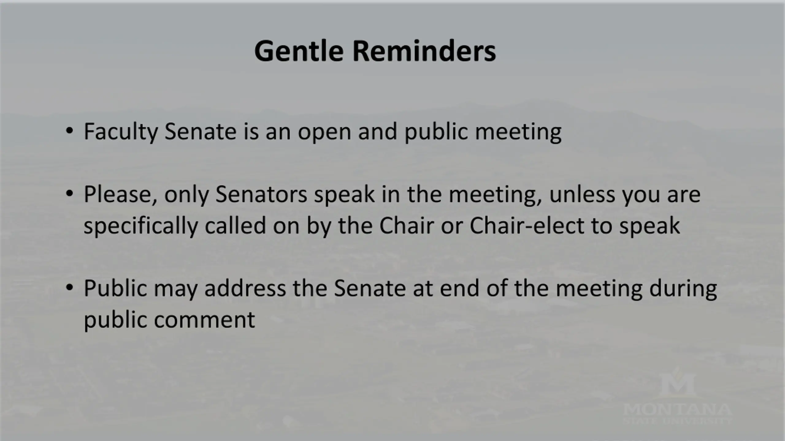 Gentle Reminders Faculty Senate is an open and public meeting Please, only Senators speak in the meeting, unless you are specifically called on by the Chair or Chair-elect to speak Public may address the Senate at end of the meeting during public comment