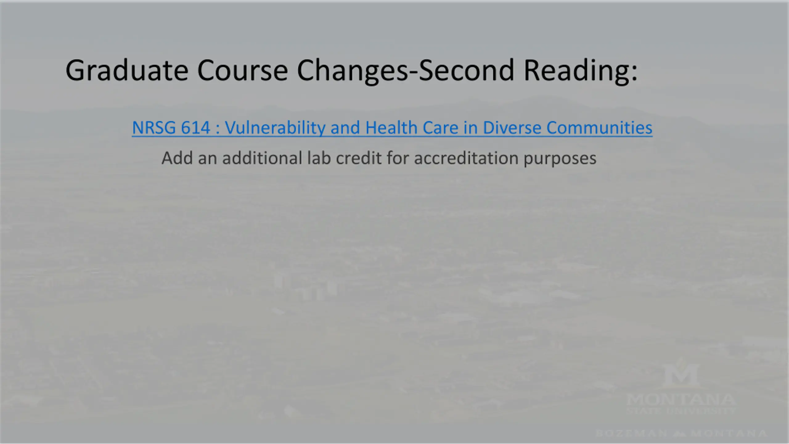 Graduate Course Changes-Second Reading: NRSG 614 : Vulnerability and Health Care in Diverse Communities Add an additional lab credit for accreditation purposes