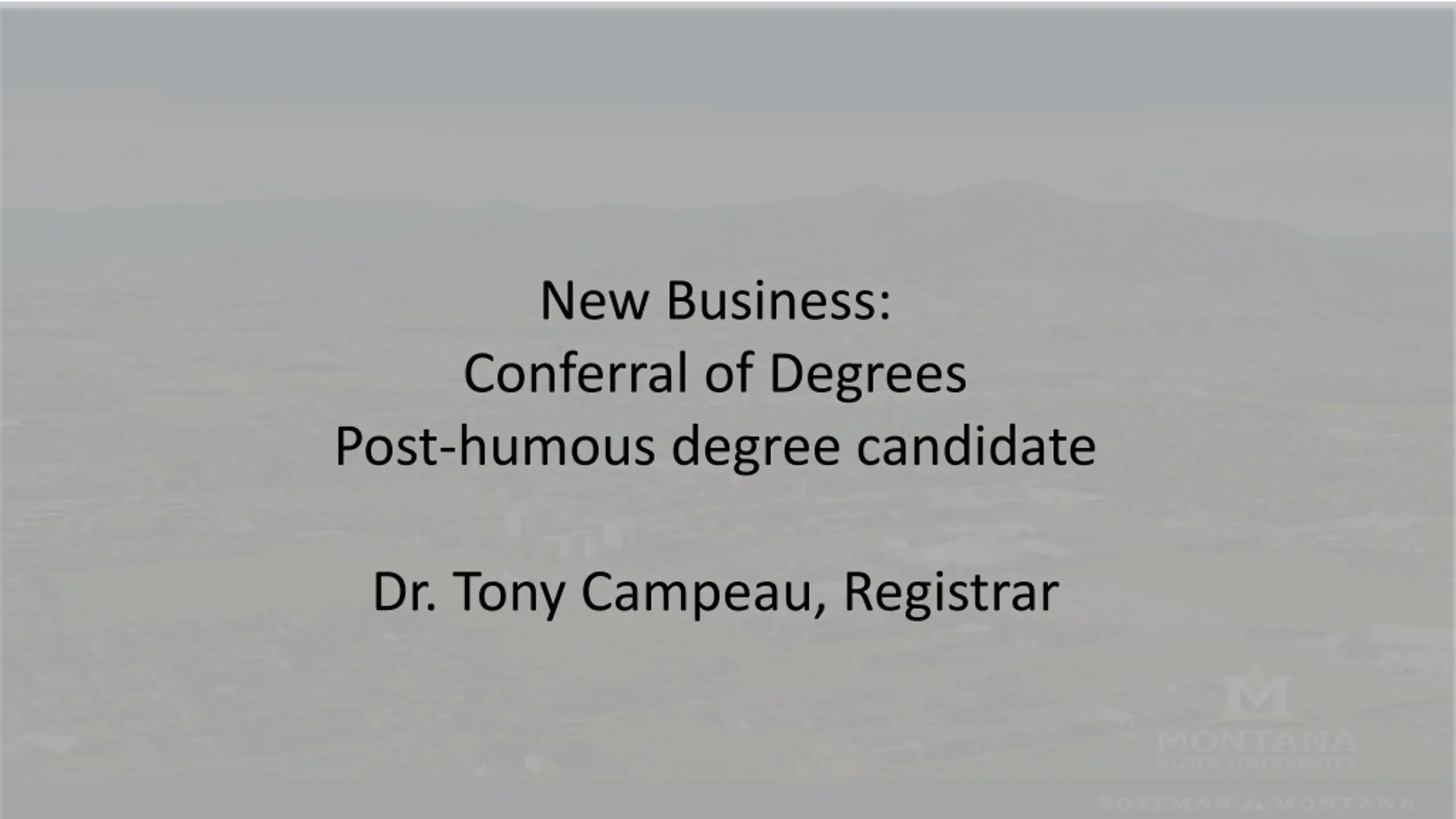 New Business: Conferral of Degrees Post-humous degree candidate Dr. Tony Campeau, Registrar