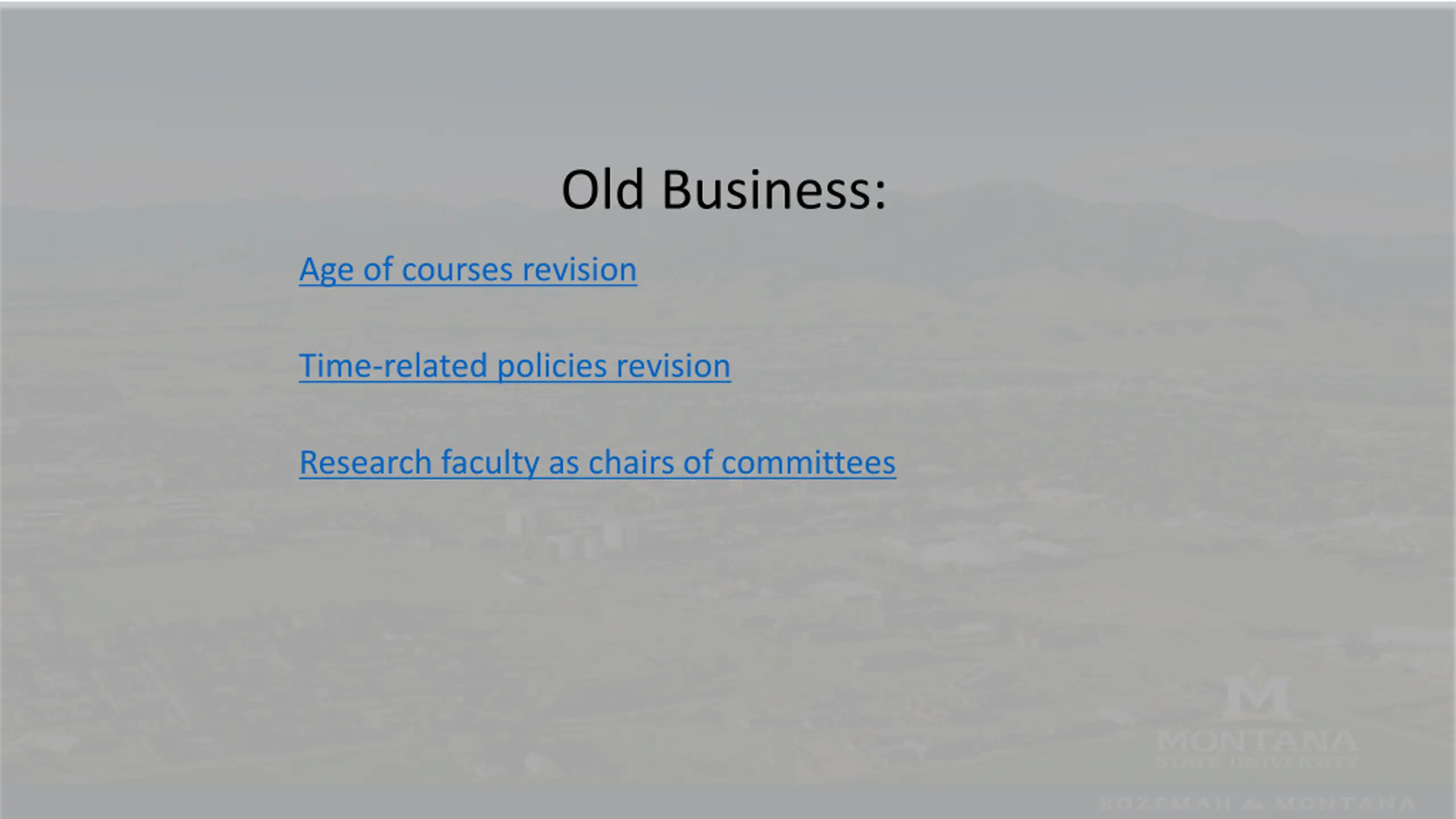 Old Business: Age of courses revision Time-related policies revision Research faculty as chairs of committees