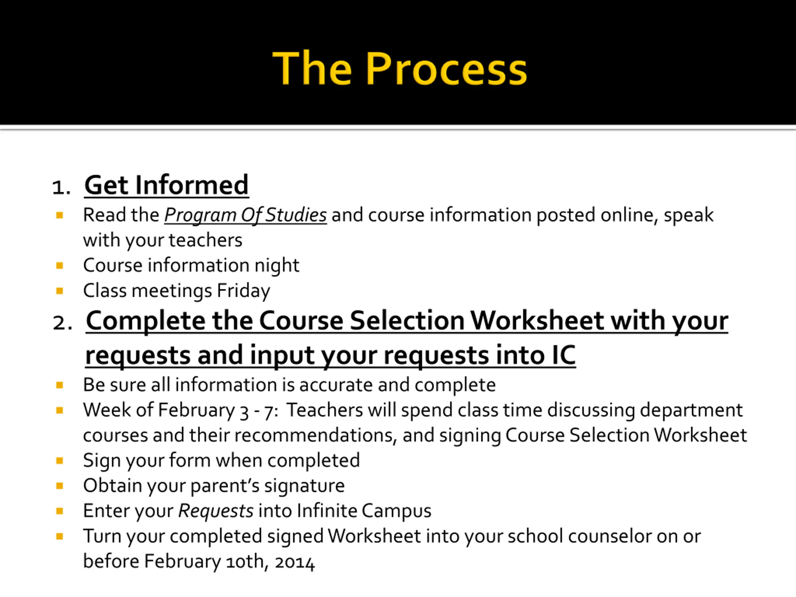 1. Get Informed Read the Program Of Studies and course information posted online, speak with your teachers Course information night Class meetings Friday 2. Complete the Course Selection Worksheet with your requests and input your requests into IC Be sure all information is accurate and complete Week of February 3 - 7: Teachers will spend class time discussing department courses and their recommendations, and signing Course Selection Worksheet Sign your form when completed Obtain your parent s signature Enter your Requests into Infinite Campus Turn your completed signed Worksheet into your school counselor on or before February 10th, 2014