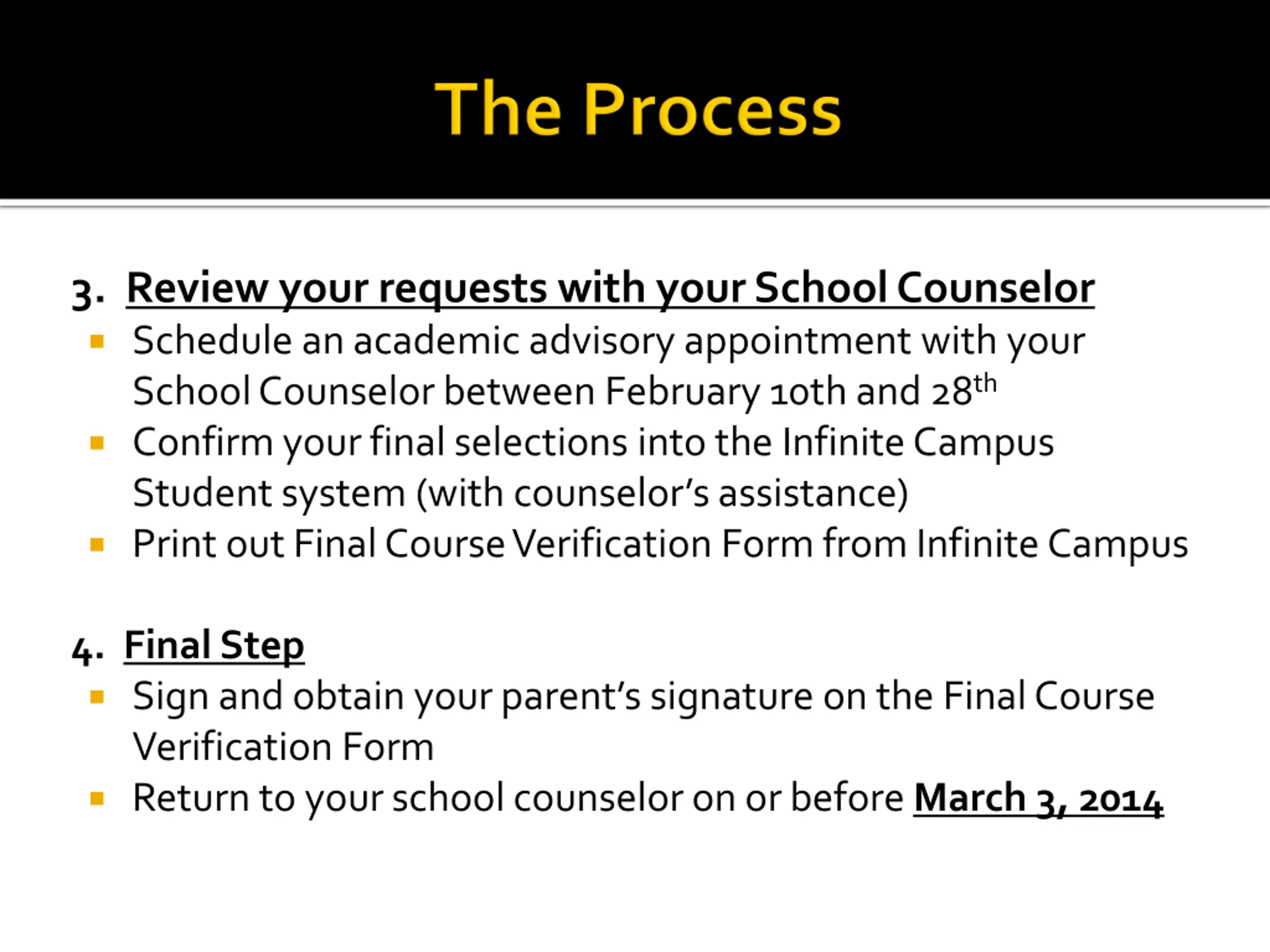 3. Review your requests with your School Counselor Schedule an academic advisory appointment with your School Counselor between February 10th and 28th Confirm your final selections into the Infinite Campus Student system (with counselor s assistance) Print out Final Course Verification Form from Infinite Campus 4. Final Step Sign and obtain your parent s signature on the Final Course Verification Form Return to your school counselor on or before March 3, 2014