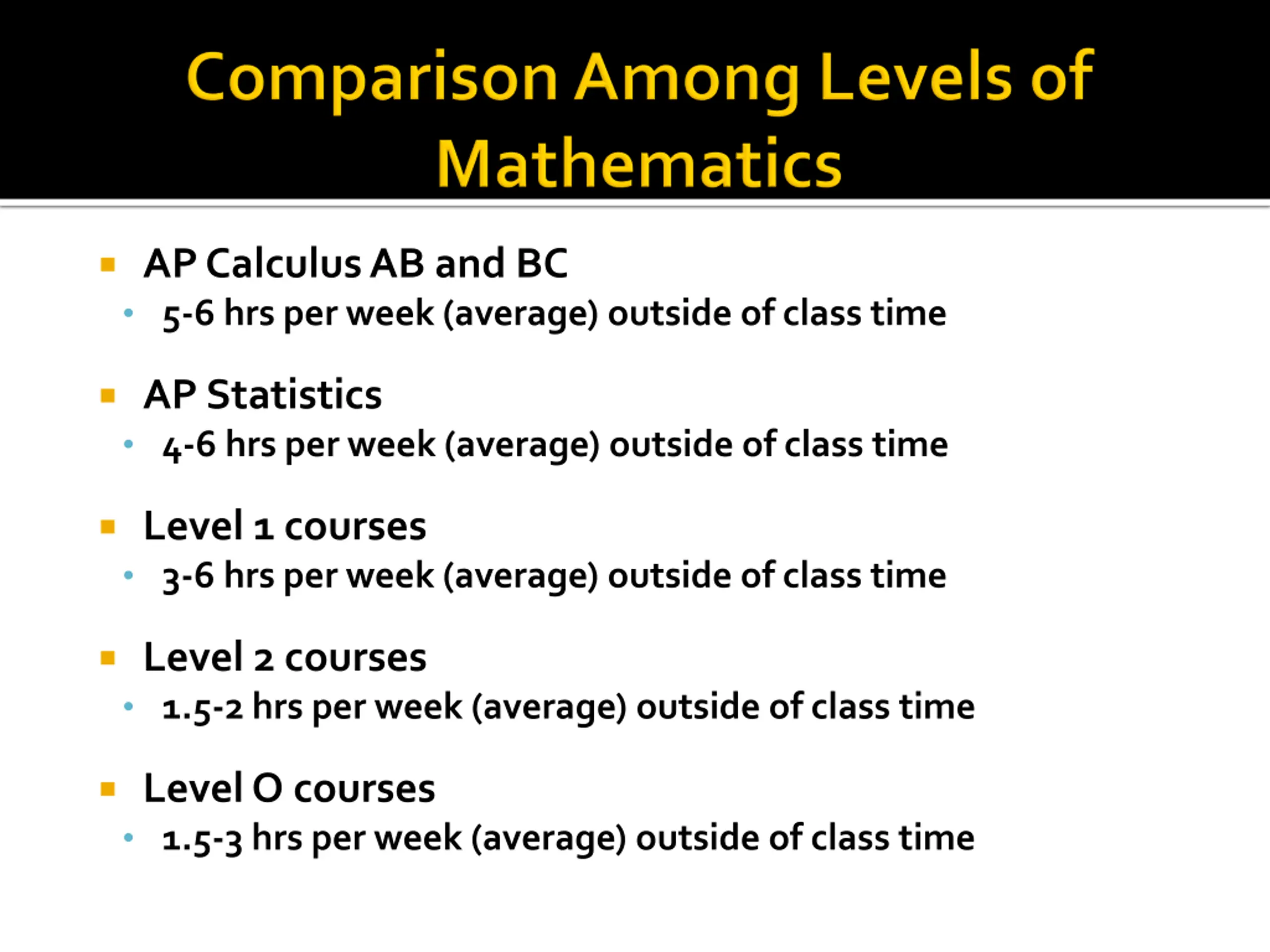 AP Calculus AB and BC 5-6 hrs per week (average) outside of class time AP Statistics 4-6 hrs per week (average) outside of class time Level 1 courses 3-6 hrs per week (average) outside of class time Level 2 courses 1.5-2 hrs per week (average) outside of class time Level O courses 1.5-3 hrs per week (average) outside of class time