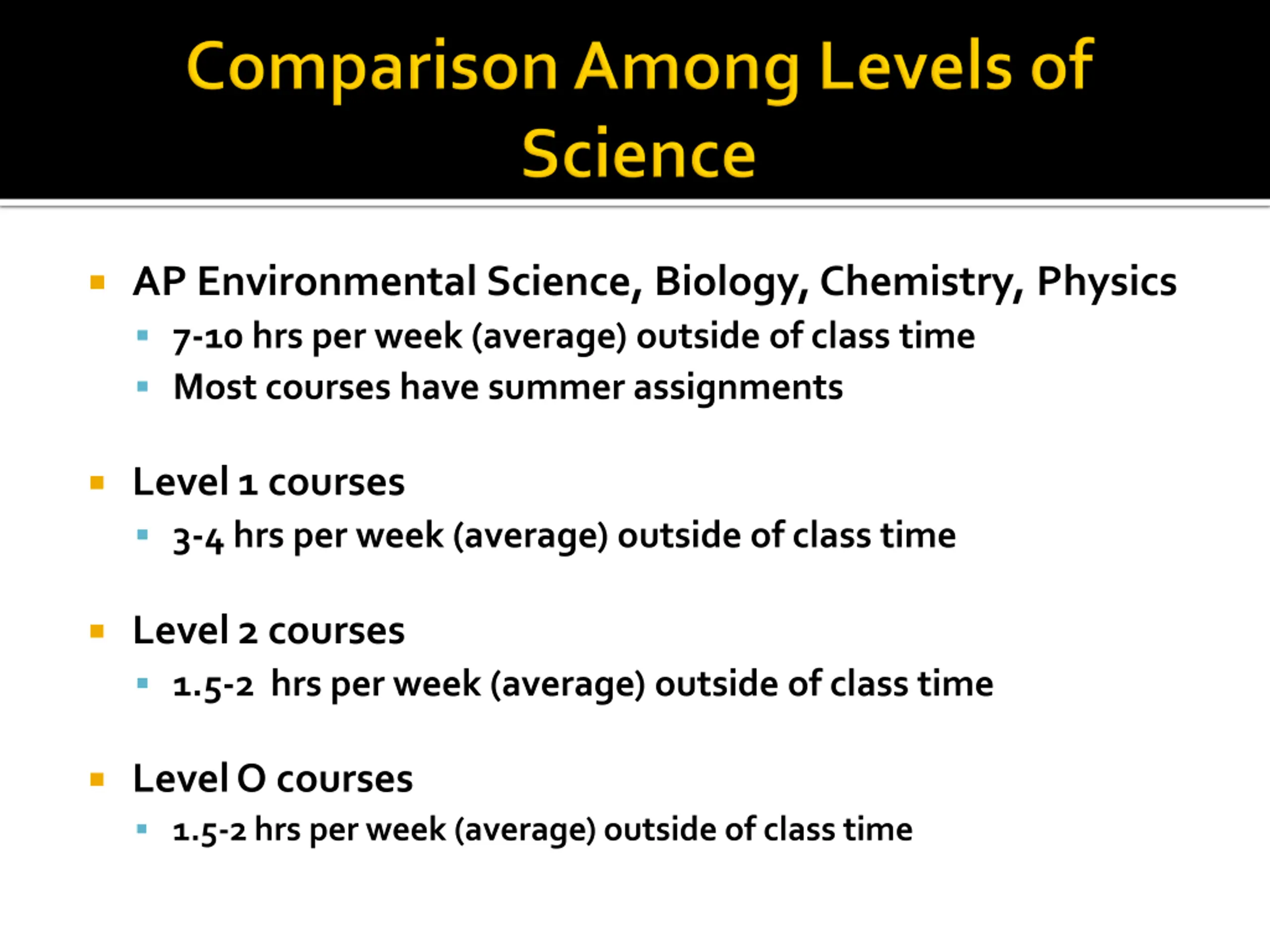 AP Environmental Science, Biology, Chemistry, Physics 7-10 hrs per week (average) outside of class time Most courses have summer assignments Level 1 courses 3-4 hrs per week (average) outside of class time Level 2 courses 1.5-2 hrs per week (average) outside of class time Level O courses 1.5-2 hrs per week (average) outside of class time
