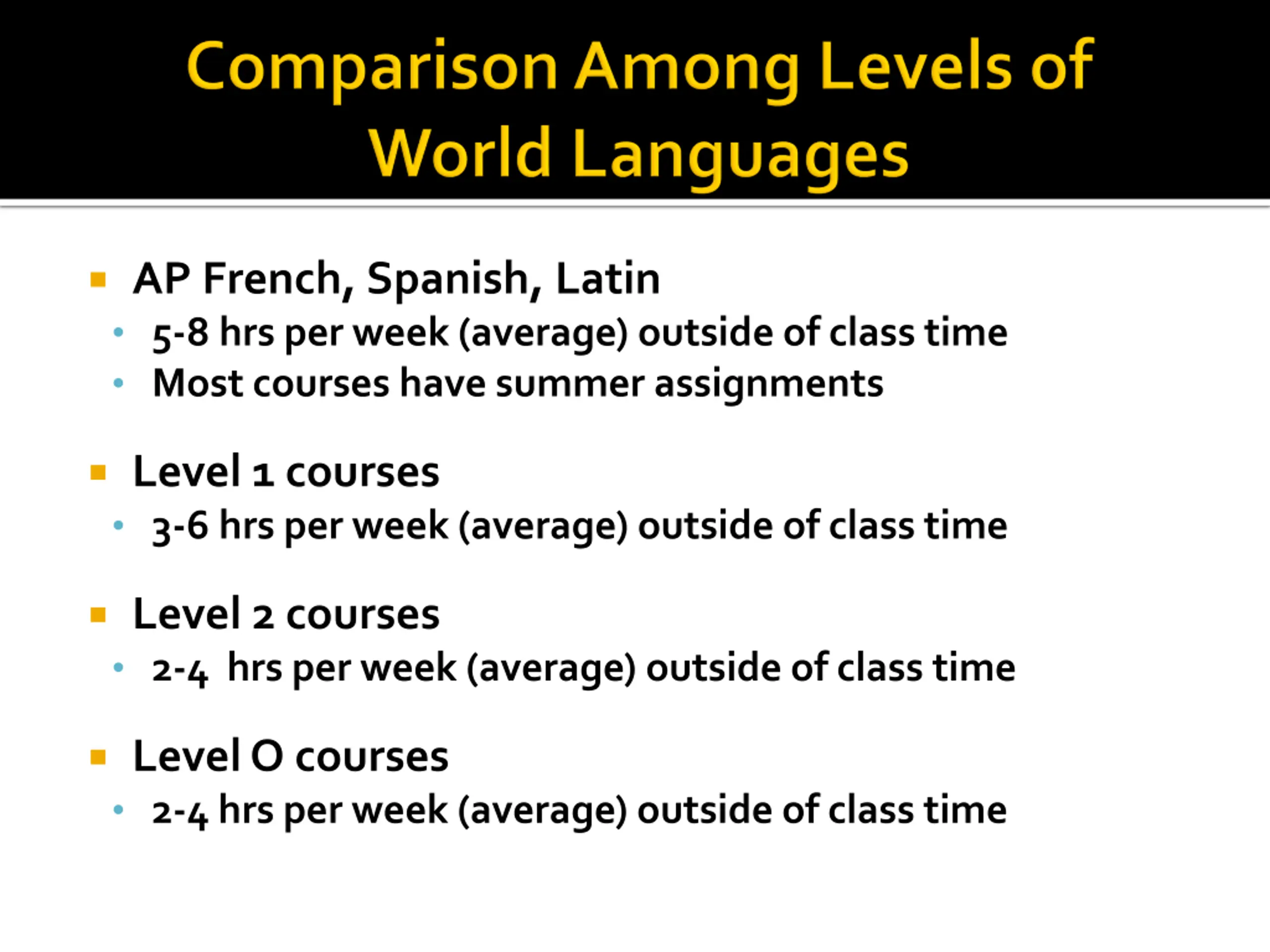 AP French, Spanish, Latin 5-8 hrs per week (average) outside of class time Most courses have summer assignments Level 1 courses 3-6 hrs per week (average) outside of class time Level 2 courses 2-4 hrs per week (average) outside of class time Level O courses 2-4 hrs per week (average) outside of class time