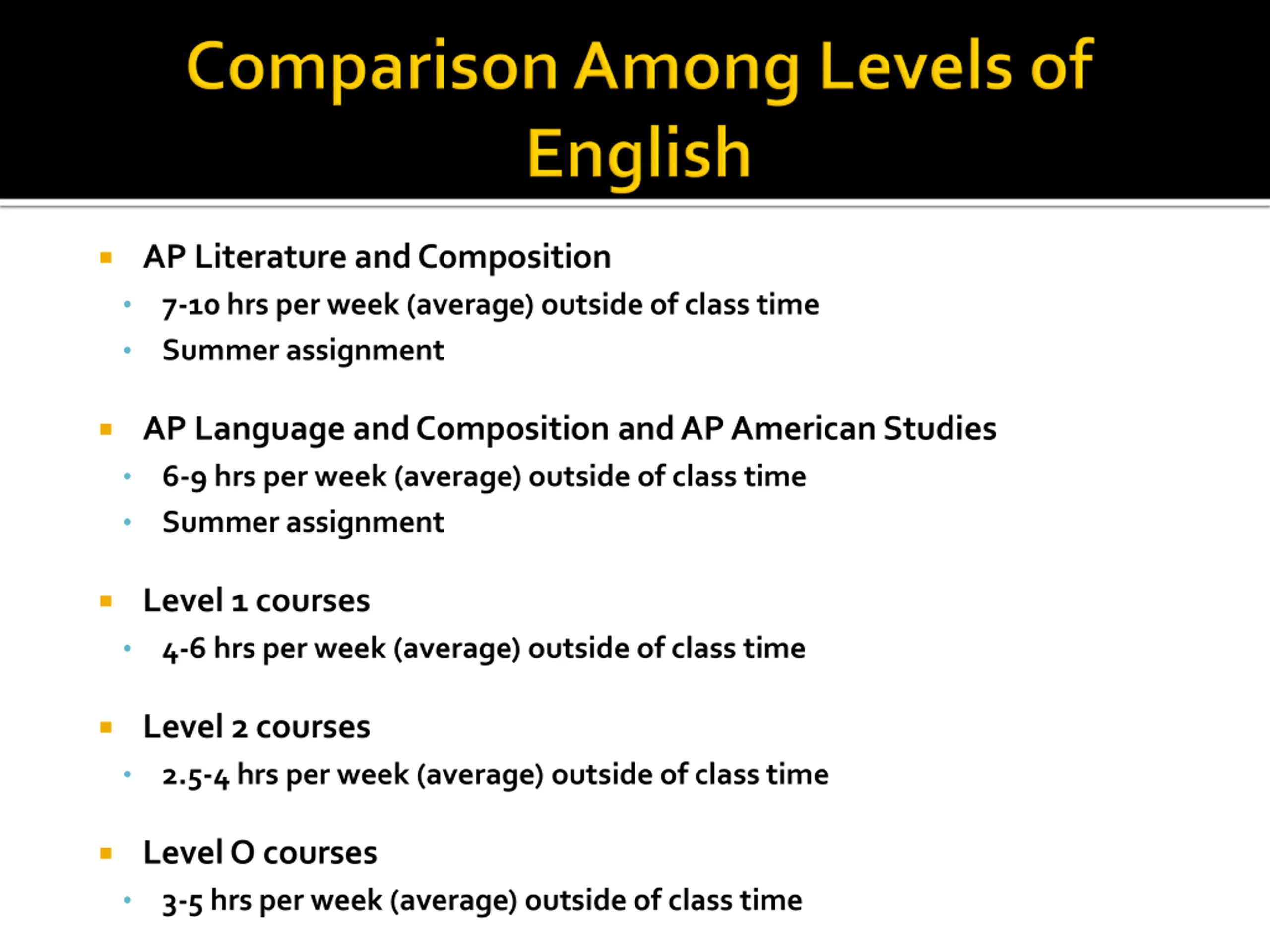 AP Literature and Composition 7-10 hrs per week (average) outside of class time Summer assignment AP Language and Composition and AP American Studies 6-9 hrs per week (average) outside of class time Summer assignment Level 1 courses 4-6 hrs per week (average) outside of class time Level 2 courses 2.5-4 hrs per week (average) outside of class time Level O courses 3-5 hrs per week (average) outside of class time