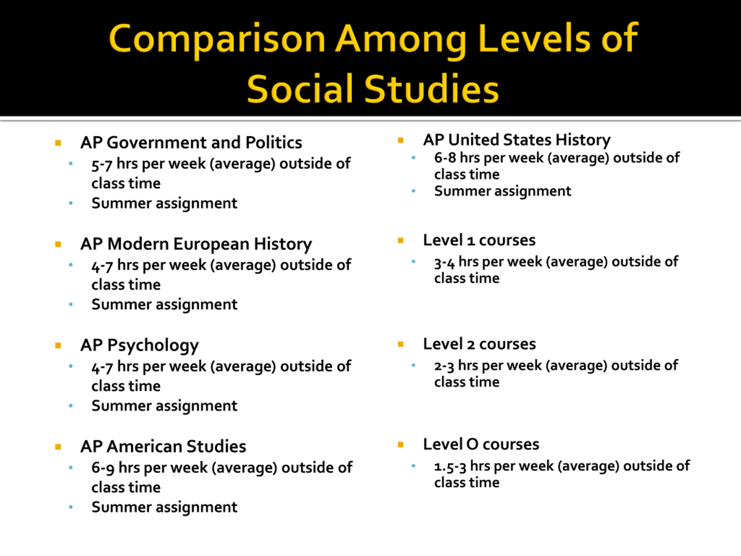 AP United States History 6-8 hrs per week (average) outside of class time Summer assignment AP Government and Politics 5-7 hrs per week (average) outside of class time Summer assignment Level 1 courses 3-4 hrs per week (average) outside of class time AP Modern European History 4-7 hrs per week (average) outside of class time Summer assignment Level 2 courses 2-3 hrs per week (average) outside of class time AP Psychology 4-7 hrs per week (average) outside of class time Summer assignment Level O courses 1.5-3 hrs per week (average) outside of class time AP American Studies 6-9 hrs per week (average) outside of class time Summer assignment