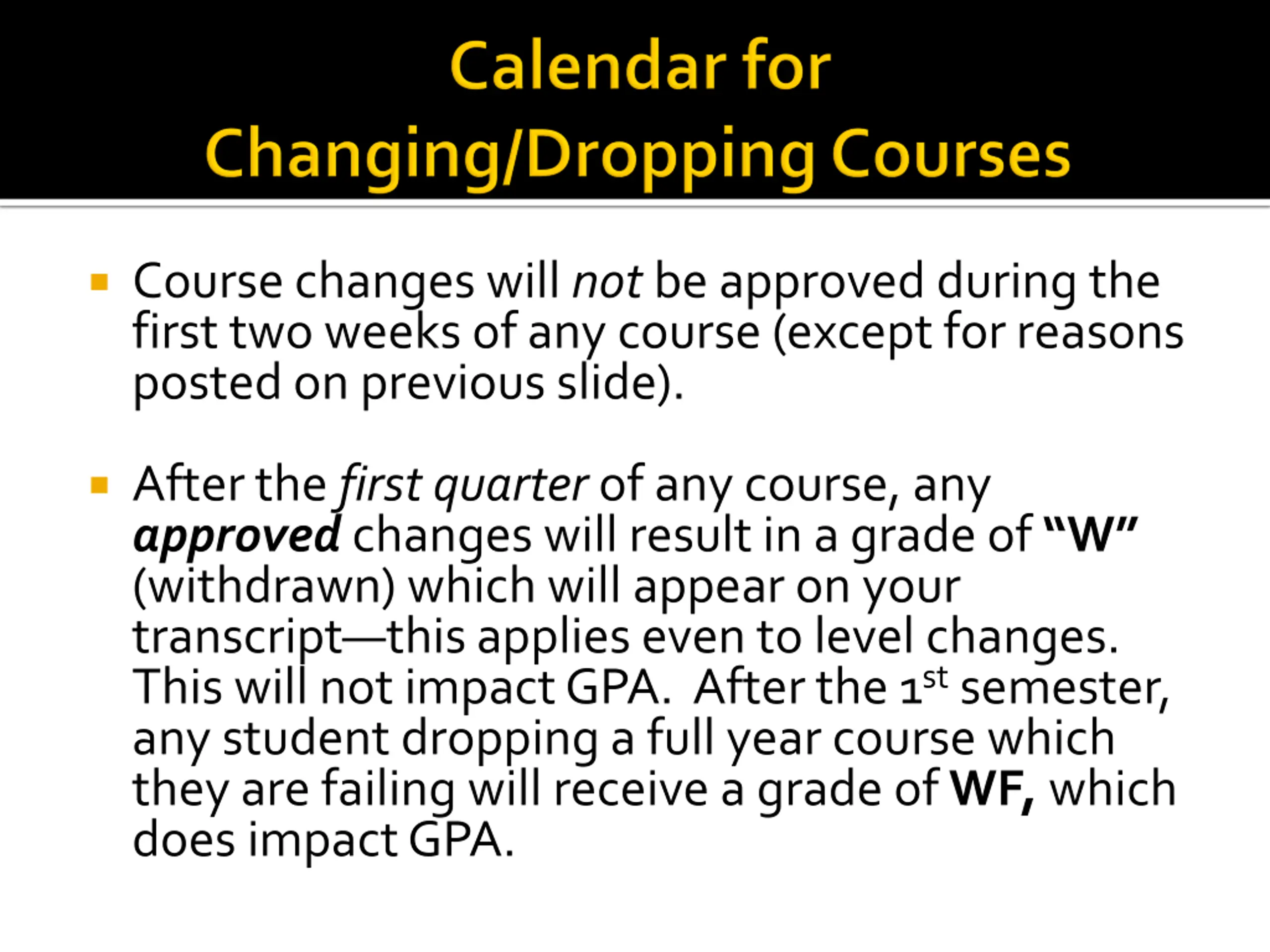 Course changes will not be approved during the first two weeks of any course (except for reasons posted on previous slide). After the first quarter of any course, any approved changes will result in a grade of W (withdrawn) which will appear on your transcript this applies even to level changes. This will not impact GPA. After the 1st semester, any student dropping a full year course which they are failing will receive a grade of WF, which does impact GPA.