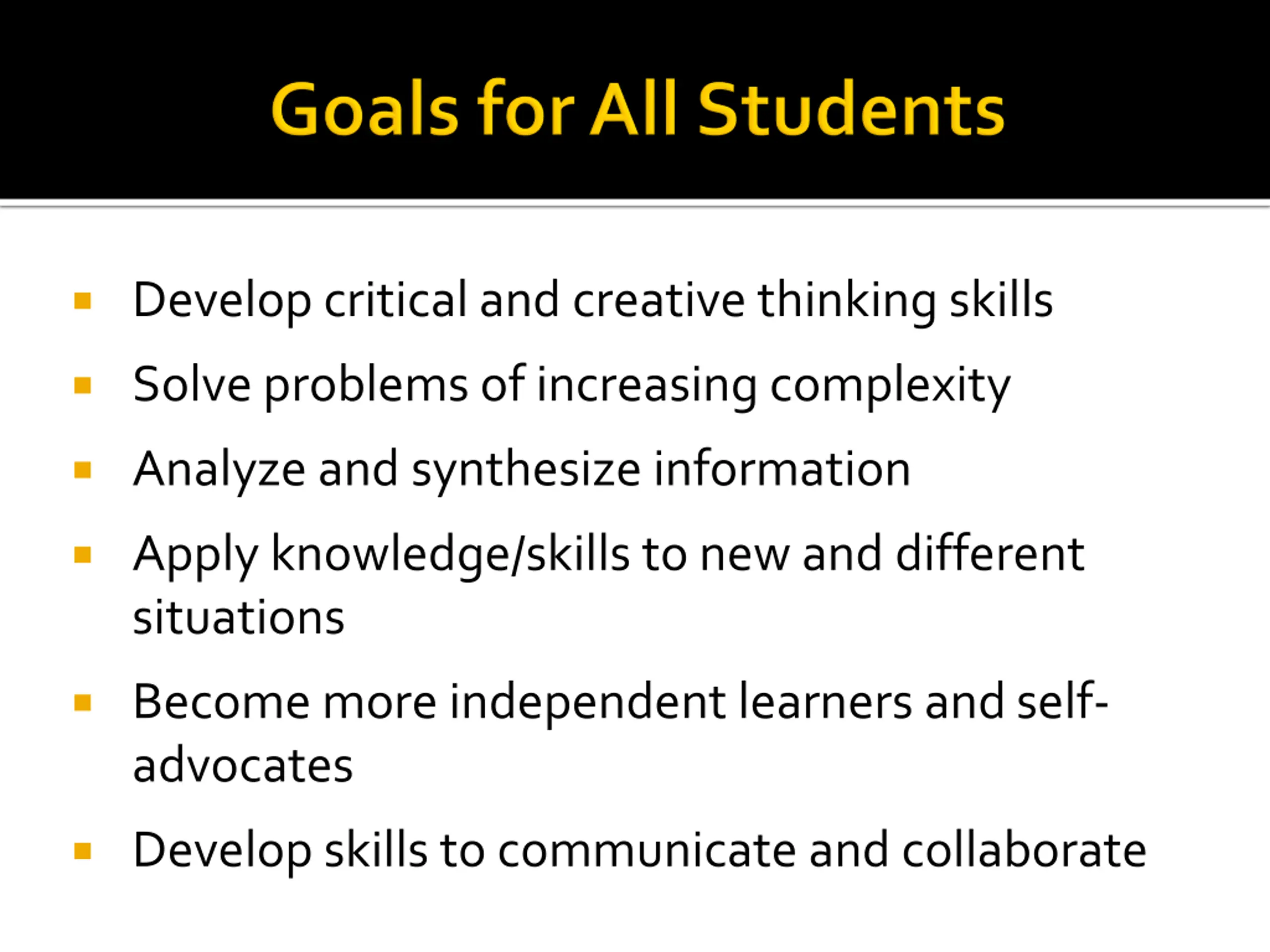 Develop critical and creative thinking skills Solve problems of increasing complexity Analyze and synthesize information Apply knowledge/skills to new and different situations Become more independent learners and self- advocates Develop skills to communicate and collaborate