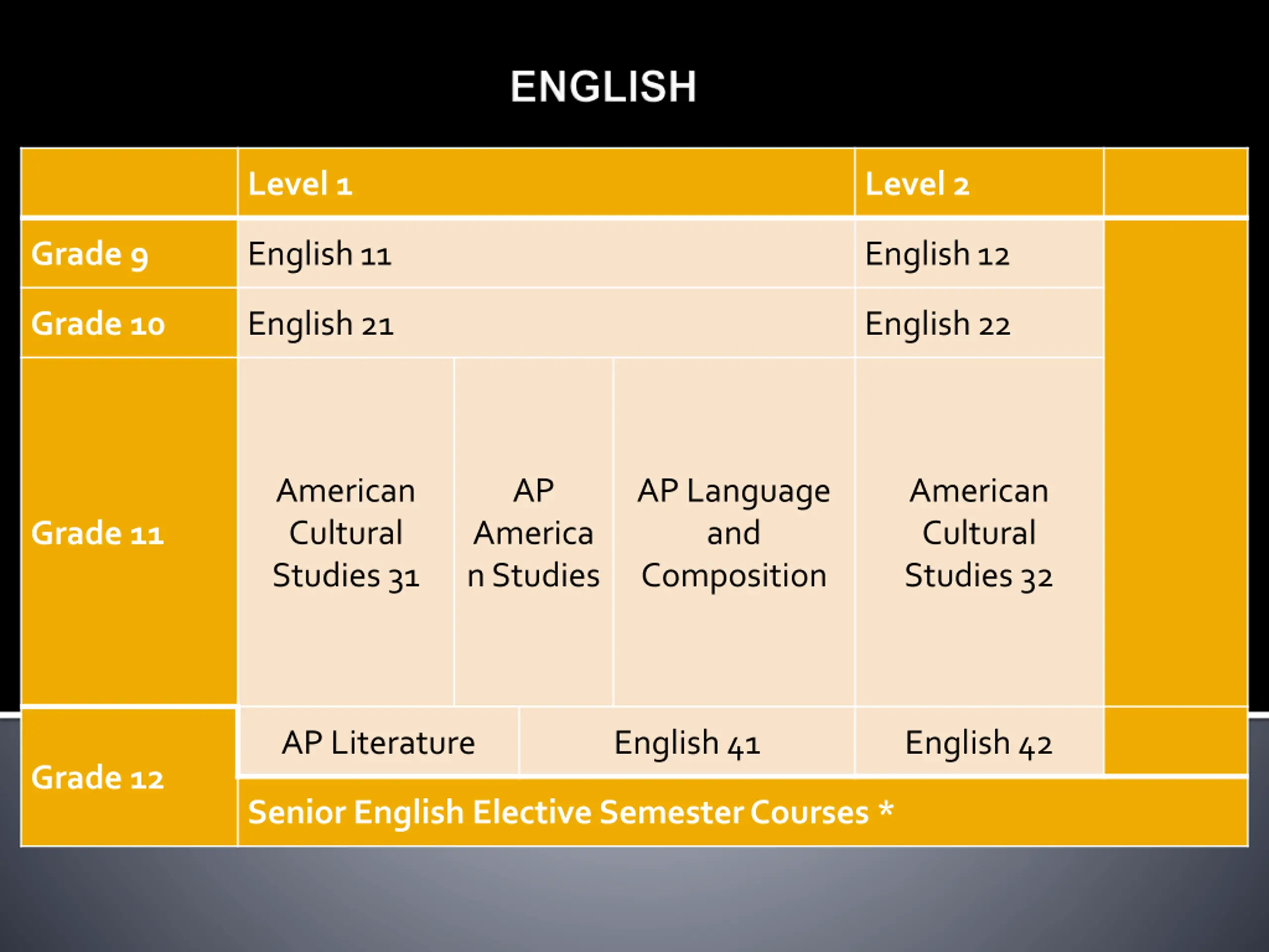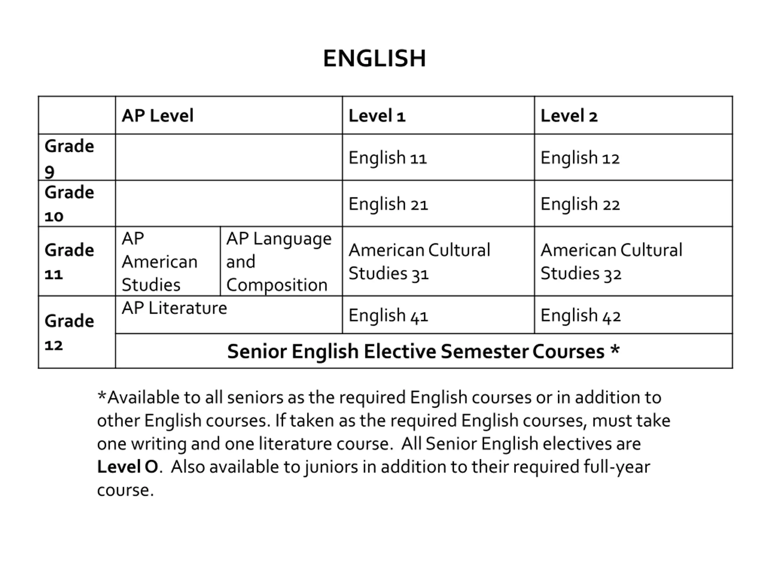 ENGLISH AP Level Level 1 Level 2 Grade 9 Grade 10 English 11 English 12 English 21 English 22 AP American Studies AP Literature AP Language and Composition Grade 11 American Cultural Studies 31 American Cultural Studies 32 English 41 English 42 Grade 12 Senior English Elective Semester Courses * *Available to all seniors as the required English courses or in addition to other English courses. If taken as the required English courses, must take one writing and one literature course. All Senior English electives are Level O. Also available to juniors in addition to their required full-year course.