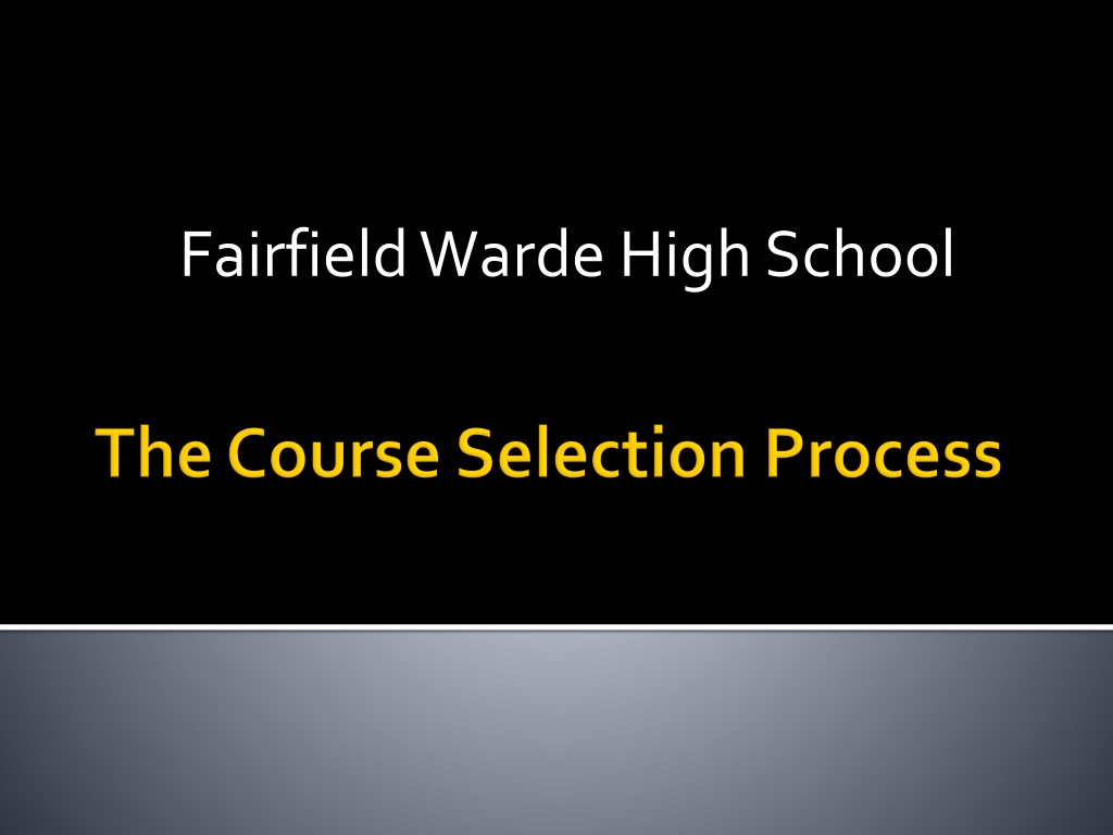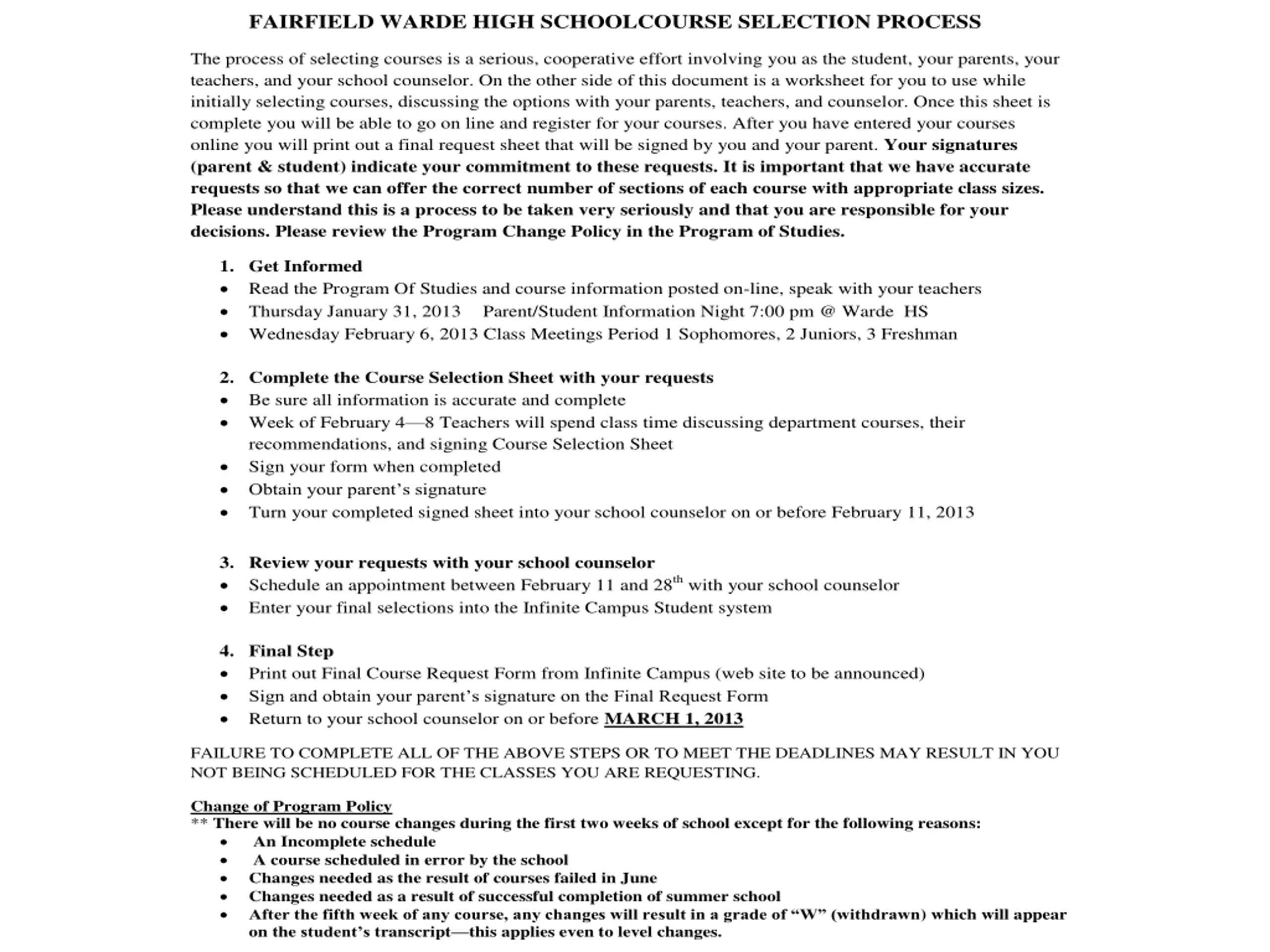 FAIRFIELD WARDE HIGH SCHOOLCOURSE SELECTION PROCESS The process of selecting courses is a serious, cooperative effort involving you as the student, your parents, your teachers, and your school counselor. On the other side of this document is a worksheet for you to use while initially selecting courses, discussing the options with your parents, teachers, and counselor. Once this sheet is complete you will be able to go on line and register for your courses. After you have entered your courses online you will print out a final request sheet that will be signed by you and your parent. Your signatures (parent & student) indicate your commitment to these requests. It is important that we have accurate requests so that we can offer the correct number of sections of each course with appropriate class sizes. Please understand this is a process to be taken very seriously and that you are responsible for your decisions. Please review the Program Change Policy in the Program of Studies. 1.Get Informed Read the Program Of Studies and course information posted on-line, speak with your teachers Thursday January 31, 2013 Parent/Student Information Night 7:00 pm @ Warde HS Wednesday February 6, 2013 Class Meetings Period 1 Sophomores, 2 Juniors, 3 Freshman 2.Complete the Course Selection Sheet with your requests Be sure all information is accurate and complete Week of February 4 8 Teachers will spend class time discussing department courses, their recommendations, and signing Course Selection Sheet Sign your form when completed Obtain your parent s signature Turn your completed signed sheet into your school counselor on or before February 11, 2013 3.Review your requests with your school counselor Schedule an appointment between February 11 and 28th with your school counselor Enter your final selections into the Infinite Campus Student system 4.Final Step Print out Final Course Request Form from Infinite Campus (web site to be announced) Sign and obtain your parent s signature on the Final Request Form Return to your school counselor on or before MARCH 1, 2013 FAILURE TO COMPLETE ALL OF THE ABOVE STEPS OR TO MEET THE DEADLINES MAY RESULT IN YOU NOT BEING SCHEDULED FOR THE CLASSES YOU ARE REQUESTING. Change of Program Policy ** There will be no course changes during the first two weeks of school except for the following reasons: An Incomplete schedule A course scheduled in error by the school Changes needed as the result of courses failed in June Changes needed as a result of successful completion of summer school After the fifth week of any course, any changes will result in a grade of W (withdrawn) which will appear on the student s transcript this applies even to level changes.