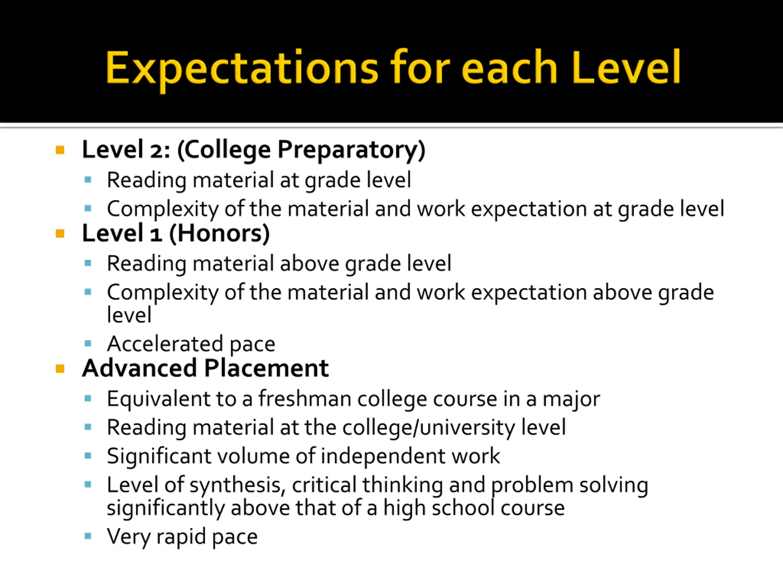 Level 2: (College Preparatory) Reading material at grade level Complexity of the material and work expectation at grade level Level 1 (Honors) Reading material above grade level Complexity of the material and work expectation above grade level Accelerated pace Advanced Placement Equivalent to a freshman college course in a major Reading material at the college/university level Significant volume of independent work Level of synthesis, critical thinking and problem solving significantly above that of a high school course Very rapid pace