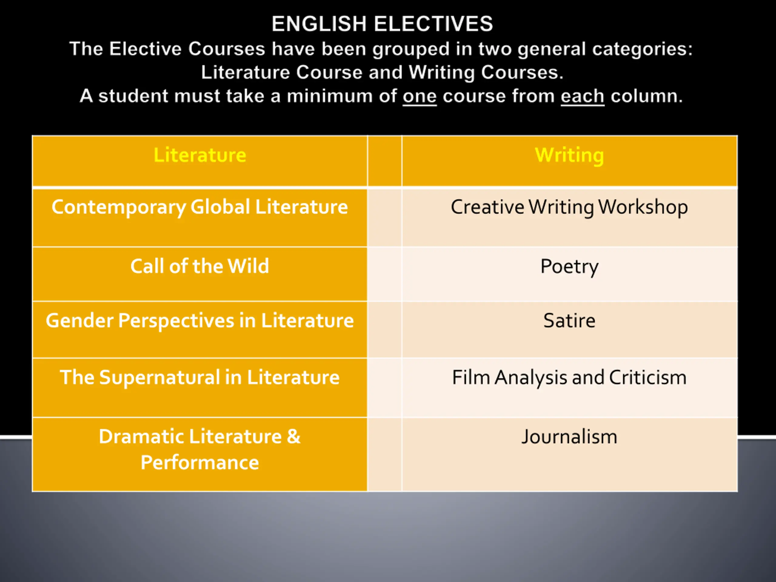 Literature Writing Contemporary Global Literature Creative Writing Workshop Call of the Wild Poetry Gender Perspectives in Literature Satire The Supernatural in Literature Film Analysis and Criticism Dramatic Literature & Performance Journalism
