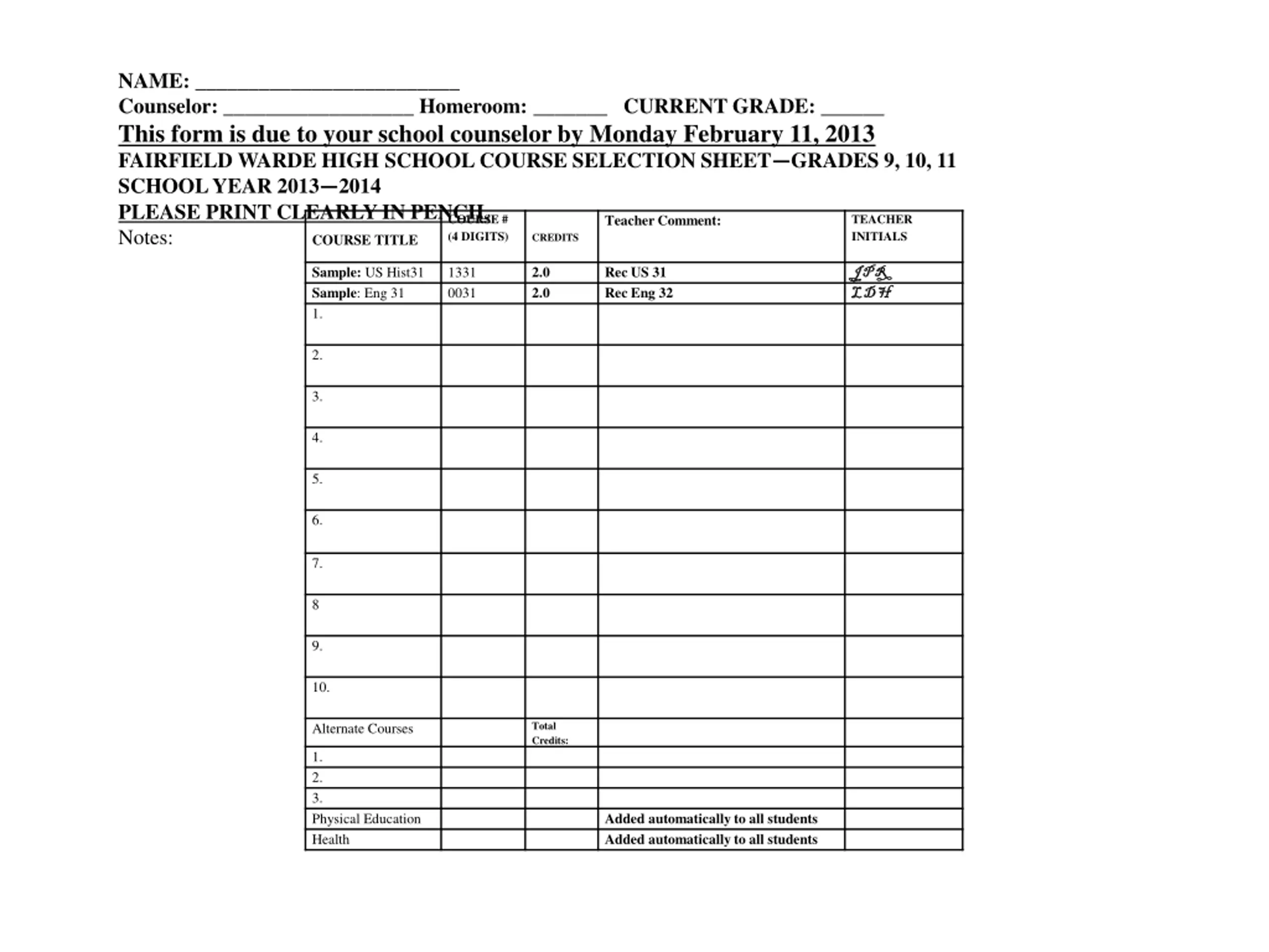NAME: _________________________ Counselor: __________________ Homeroom: _______ CURRENT GRADE: ______ This form is due to your school counselor by Monday February 11, 2013 FAIRFIELD WARDE HIGH SCHOOL COURSE SELECTION SHEET GRADES 9, 10, 11 SCHOOL YEAR 2013 2014 PLEASE PRINT CLEARLY IN PENCIL Notes: COURSE # (4 DIGITS) TEACHER INITIALS Teacher Comment: CREDITS COURSE TITLE Sample: US Hist31 Sample: Eng 31 1. 2.0 2.0 Rec US 31 Rec Eng 32 1331 0031 J P R J P R L D H L D H 2. 3. 4. 5. 6. 7. 8 9. 10. Total Credits: Alternate Courses 1. 2. 3. Physical Education Health Added automatically to all students Added automatically to all students