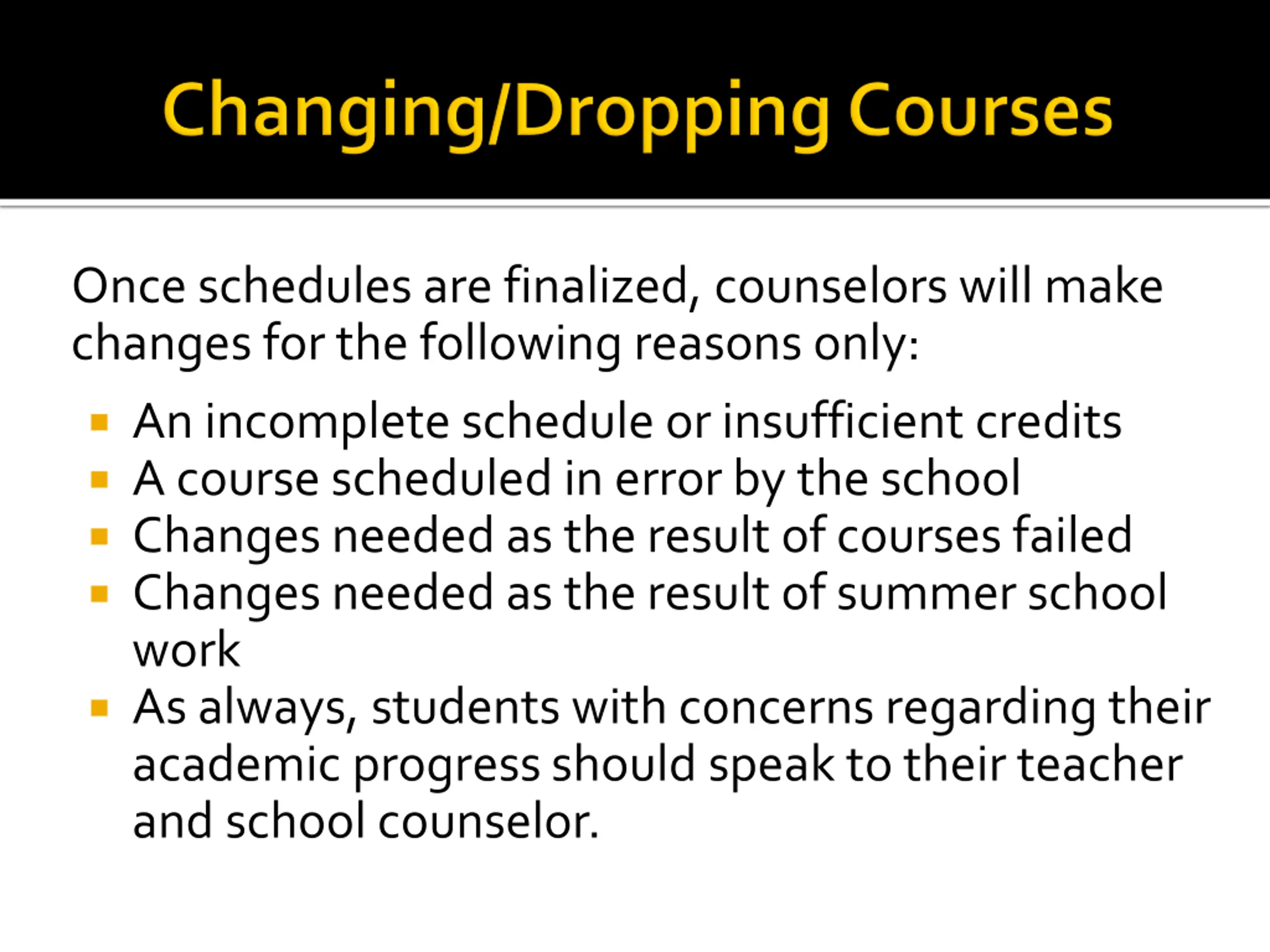 Once schedules are finalized, counselors will make changes for the following reasons only: An incomplete schedule or insufficient credits A course scheduled in error by the school Changes needed as the result of courses failed Changes needed as the result of summer school work As always, students with concerns regarding their academic progress should speak to their teacher and school counselor.