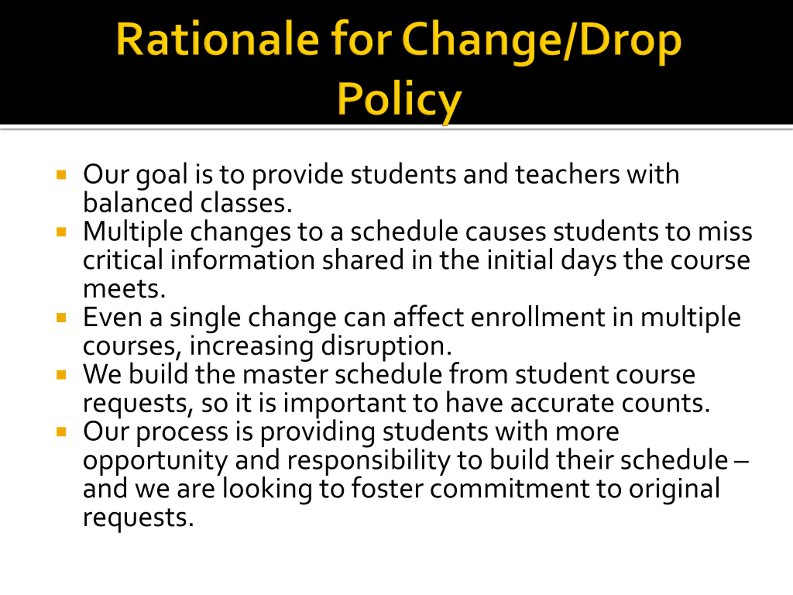 Our goal is to provide students and teachers with balanced classes. Multiple changes to a schedule causes students to miss critical information shared in the initial days the course meets. Even a single change can affect enrollment in multiple courses, increasing disruption. We build the master schedule from student course requests, so it is important to have accurate counts. Our process is providing students with more opportunity and responsibility to build their schedule and we are looking to foster commitment to original requests.