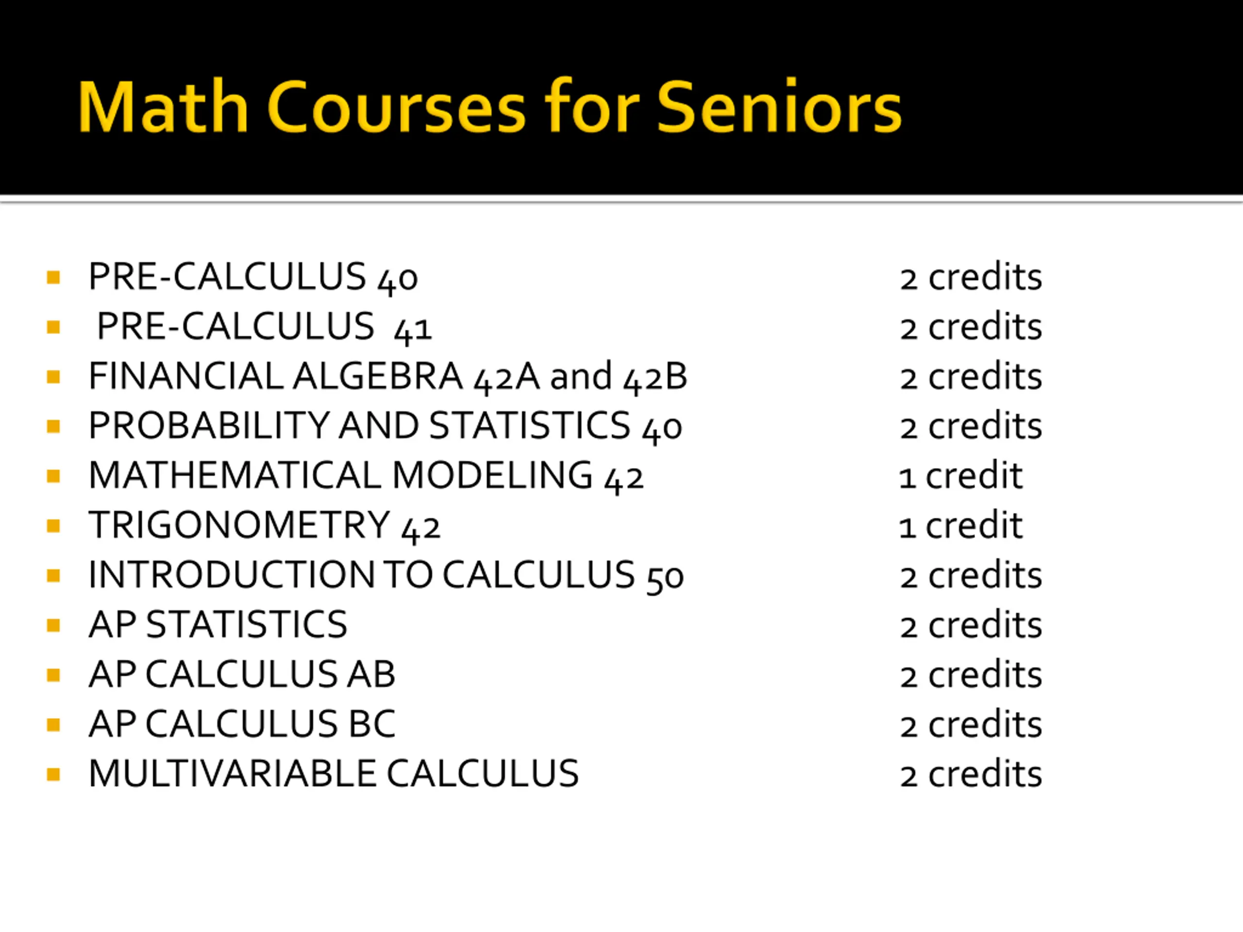 PRE-CALCULUS 40 PRE-CALCULUS 41 FINANCIAL ALGEBRA 42A and 42B PROBABILITY AND STATISTICS 40 MATHEMATICAL MODELING 42 TRIGONOMETRY 42 INTRODUCTION TO CALCULUS 50 AP STATISTICS AP CALCULUS AB AP CALCULUS BC MULTIVARIABLE CALCULUS 2 credits 2 credits 2 credits 2 credits 1 credit 1 credit 2 credits 2 credits 2 credits 2 credits 2 credits