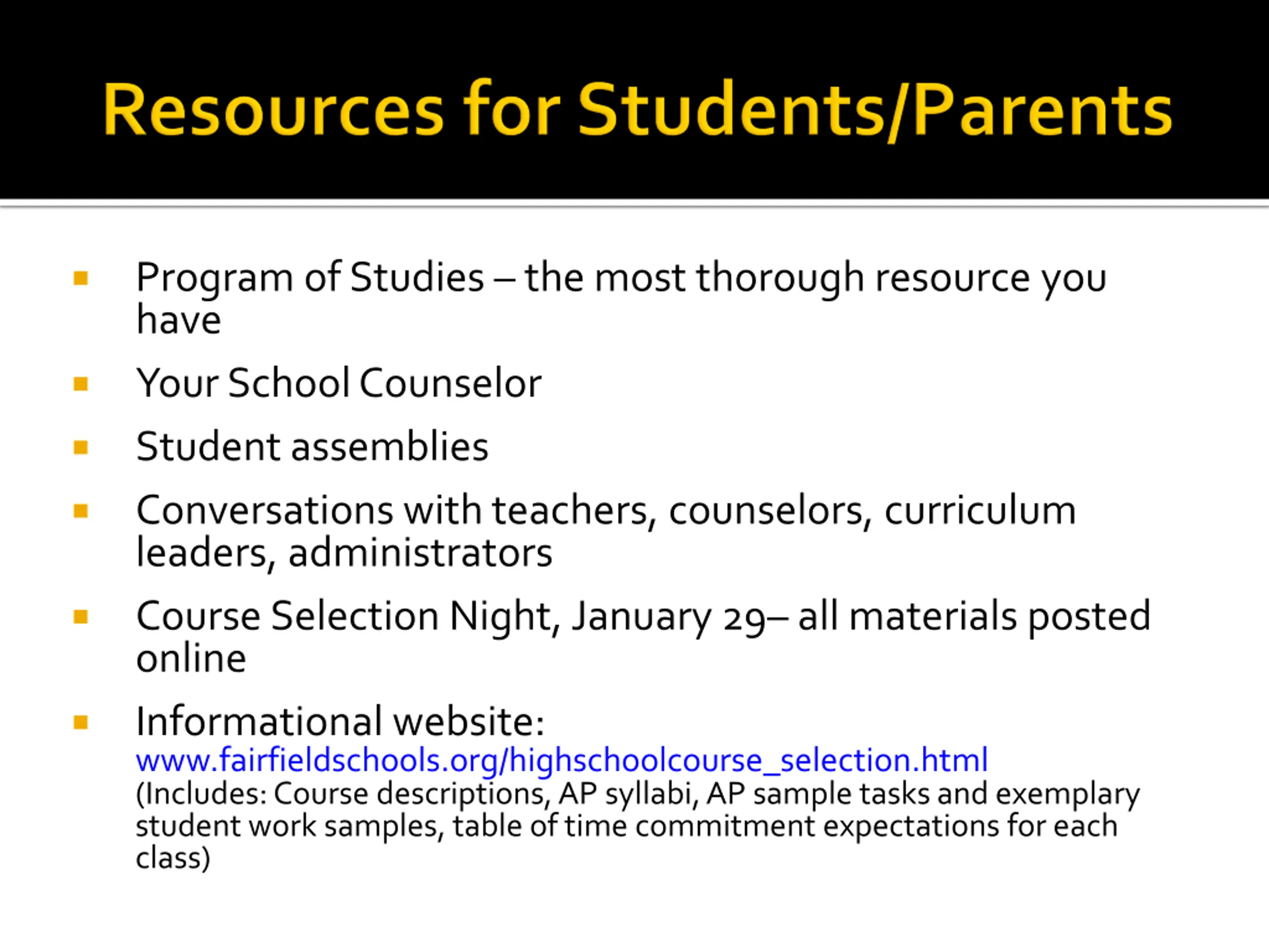 Program of Studies the most thorough resource you have Your School Counselor Student assemblies Conversations with teachers, counselors, curriculum leaders, administrators Course Selection Night, January 29 all materials posted online Informational website: www.fairfieldschools.org/highschoolcourse_selection.html (Includes: Course descriptions, AP syllabi, AP sample tasks and exemplary student work samples, table of time commitment expectations for each class)