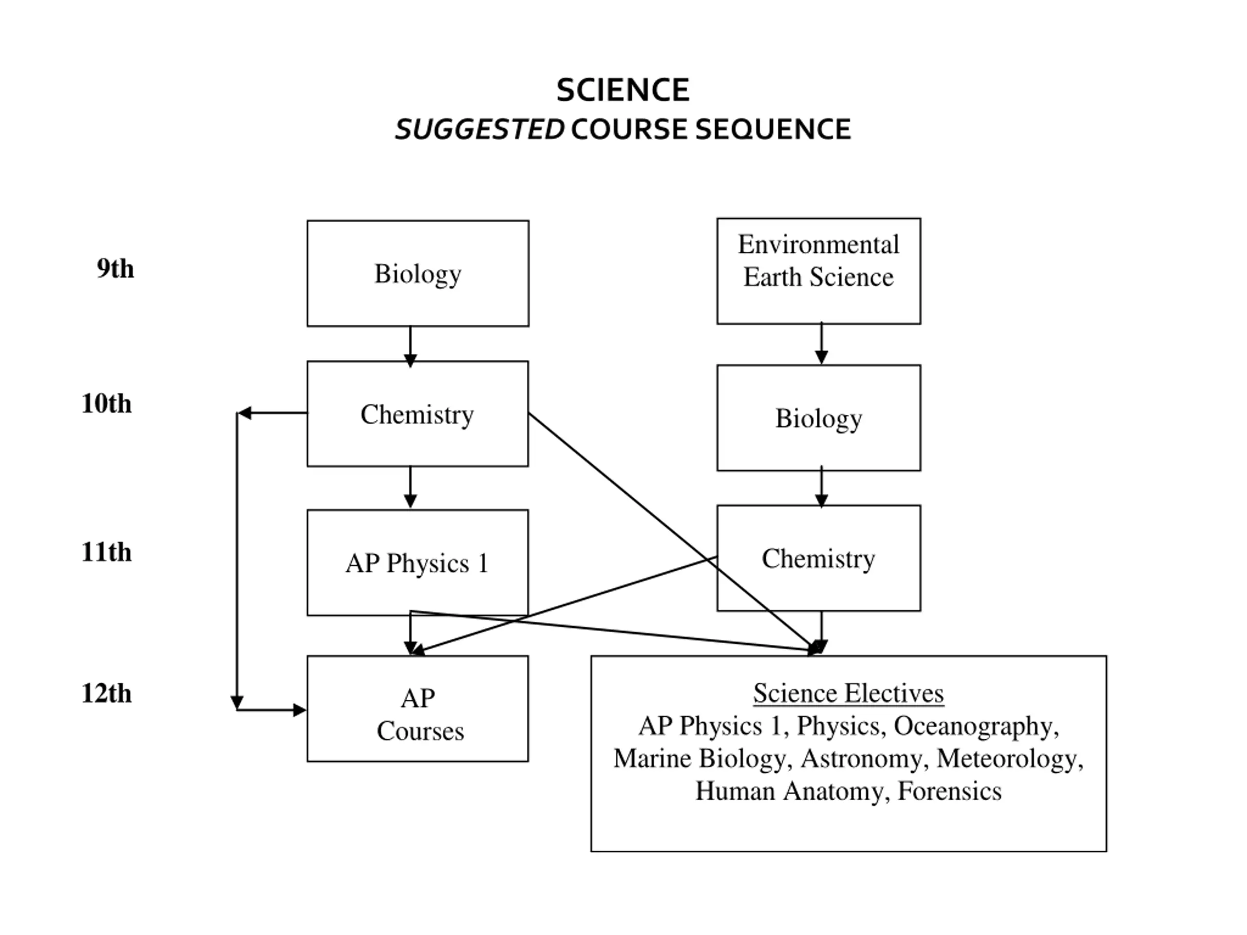 SCIENCE SUGGESTED COURSE SEQUENCE Environmental Earth Science 9th Biology 10th Chemistry Biology 11th Chemistry AP Physics 1 12th Science Electives AP AP Physics 1, Physics, Oceanography, Marine Biology, Astronomy, Meteorology, Human Anatomy, Forensics Courses