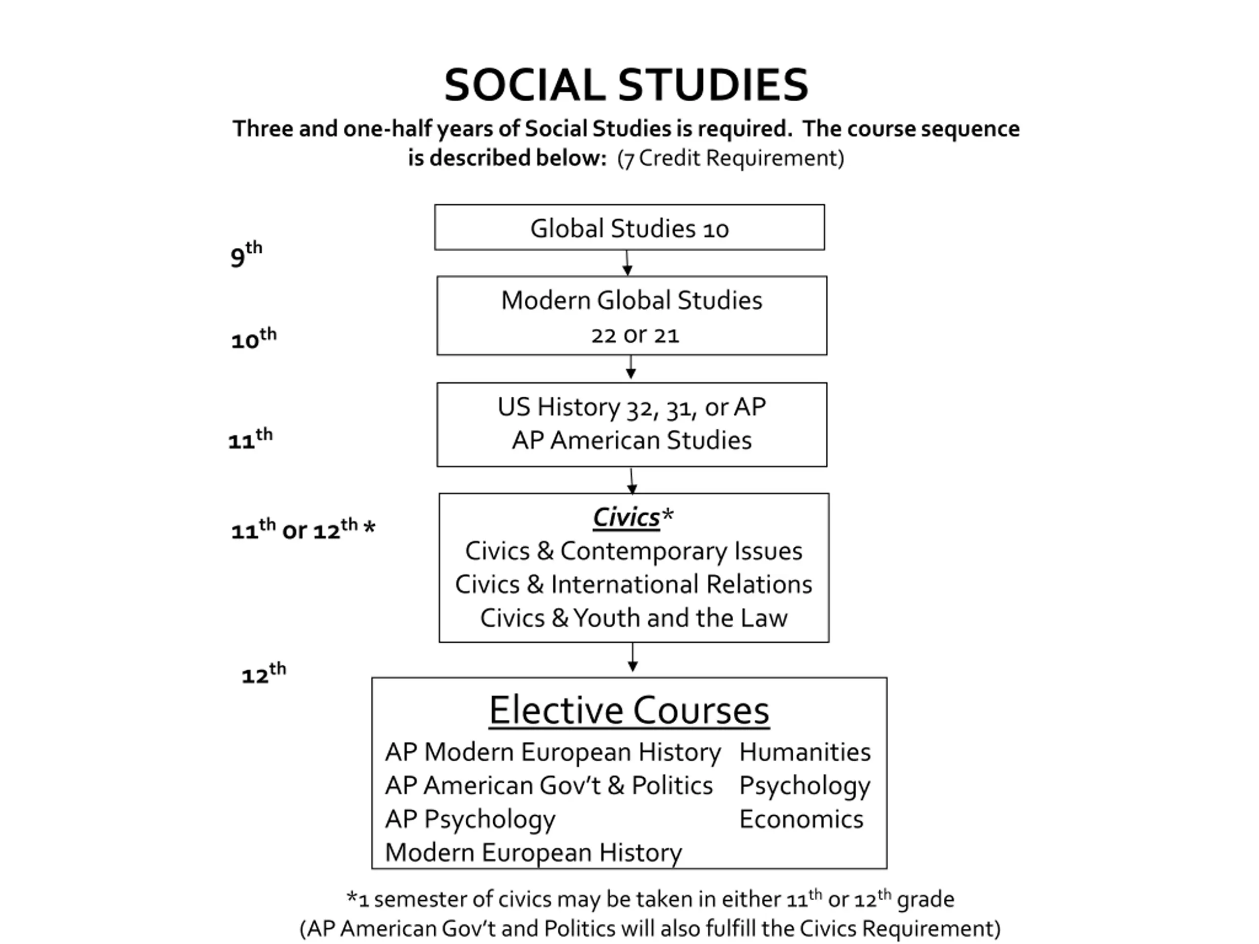 SOCIAL STUDIES Three and one-half years of Social Studies is required. The course sequence is described below: (7 Credit Requirement) Global Studies 10 9th Modern Global Studies 22 or 21 10th US History 32, 31, or AP AP American Studies 11th Civics* 11th or 12th * Civics & Contemporary Issues Civics & International Relations Civics & Youth and the Law 12th Elective Courses AP Modern European History Humanities AP American Gov t & Politics Psychology AP Psychology Modern European History Economics *1 semester of civics may be taken in either 11th or 12th grade (AP American Gov t and Politics will also fulfill the Civics Requirement)