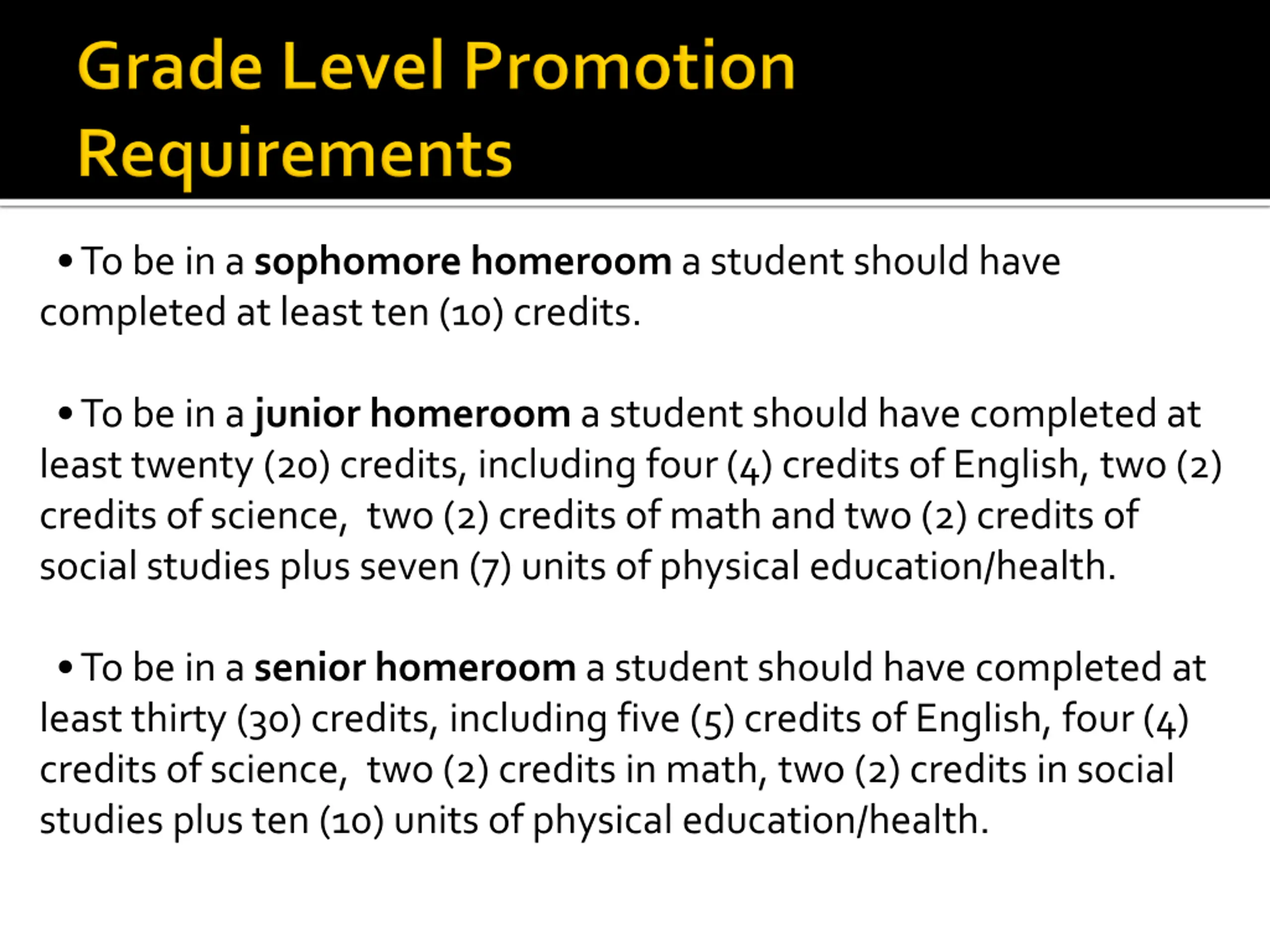 To be in a sophomore homerooma student should have completed at least ten (10) credits. To be in a junior homerooma student should have completed at least twenty (20) credits, including four (4) credits of English, two (2) credits of science, two (2) credits of math and two (2) credits of social studies plus seven (7) units of physical education/health. To be in a senior homerooma student should have completed at least thirty (30) credits, including five (5) credits of English, four (4) credits of science, two (2) credits in math, two (2) credits in social studies plus ten (10) units of physical education/health.
