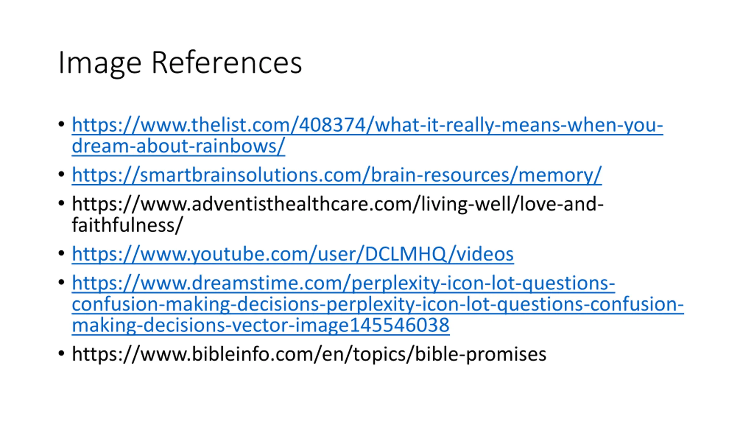 Image References https://www.thelist.com/408374/what-it-really-means-when-you- dream-about-rainbows/ https://smartbrainsolutions.com/brain-resources/memory/ https://www.adventisthealthcare.com/living-well/love-and- faithfulness/ https://www.youtube.com/user/DCLMHQ/videos https://www.dreamstime.com/perplexity-icon-lot-questions- confusion-making-decisions-perplexity-icon-lot-questions-confusion- making-decisions-vector-image145546038 https://www.bibleinfo.com/en/topics/bible-promises