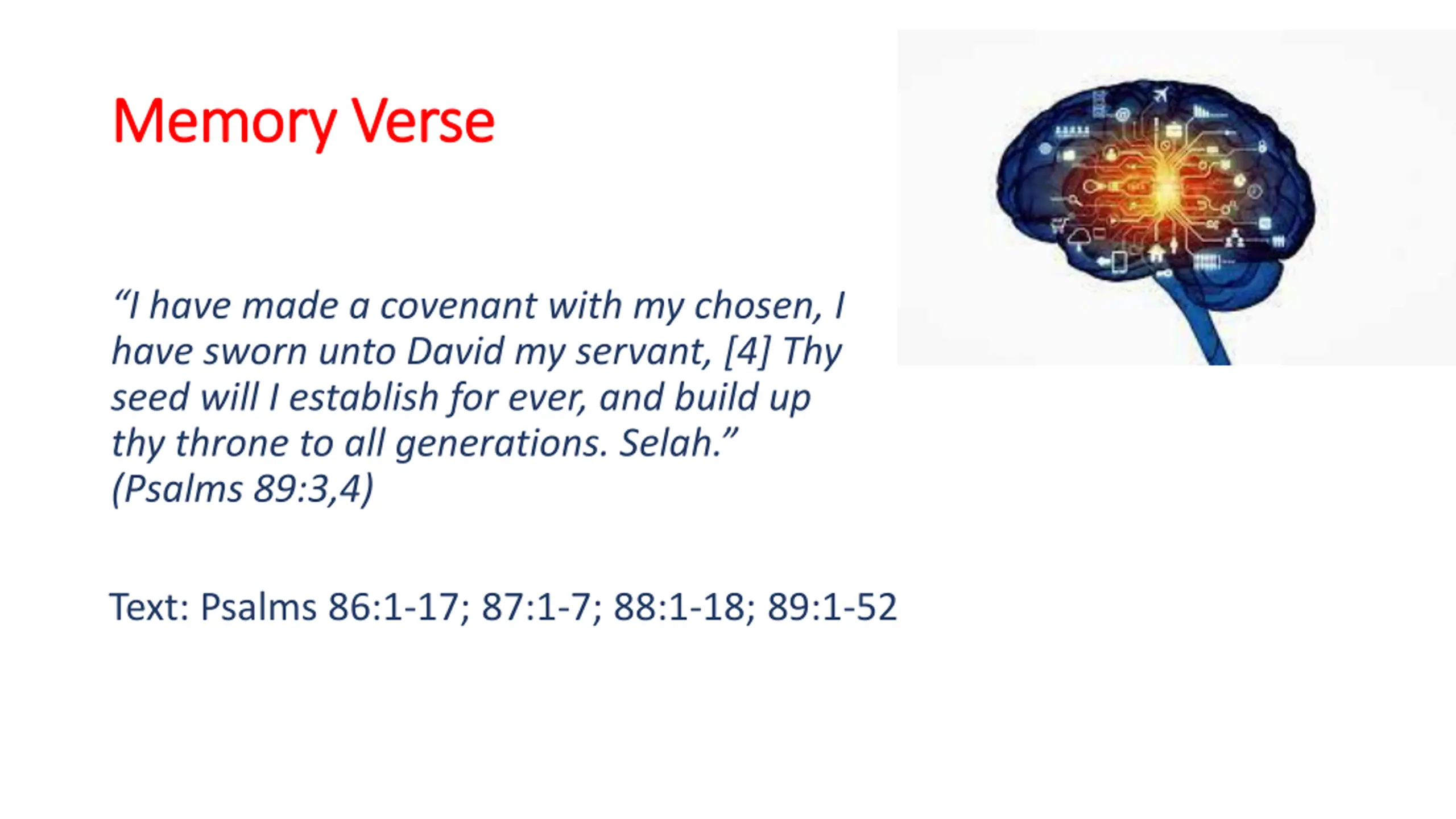 Memory Verse Memory Verse I have made a covenant with my chosen, I have sworn unto David my servant, [4] Thy seed will I establish for ever, and build up thy throne to all generations. Selah. (Psalms 89:3,4) Text: Psalms 86:1-17; 87:1-7; 88:1-18; 89:1-52