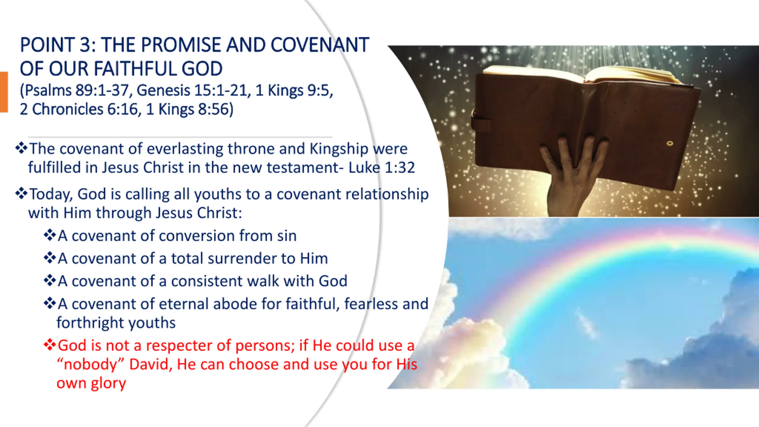 POINT 3: THE PROMISE AND COVENANT POINT 3: THE PROMISE AND COVENANT OF OUR FAITHFUL GOD OF OUR FAITHFUL GOD (Psalms 89:1 (Psalms 89:1- -37, Genesis 15:1 37, Genesis 15:1- -21, 1 Kings 9:5, 2 Chronicles 6:16, 1 Kings 8:56) 2 Chronicles 6:16, 1 Kings 8:56) 21, 1 Kings 9:5, The covenant of everlasting throne and Kingship were fulfilled in Jesus Christ in the new testament- Luke 1:32 Today, God is calling all youths to a covenant relationship with Him through Jesus Christ: A covenant of conversion from sin A covenant of a total surrender to Him A covenant of a consistent walk with God A covenant of eternal abode for faithful, fearless and forthright youths God is not a respecter of persons; if He could use a nobody David, He can choose and use you for His own glory