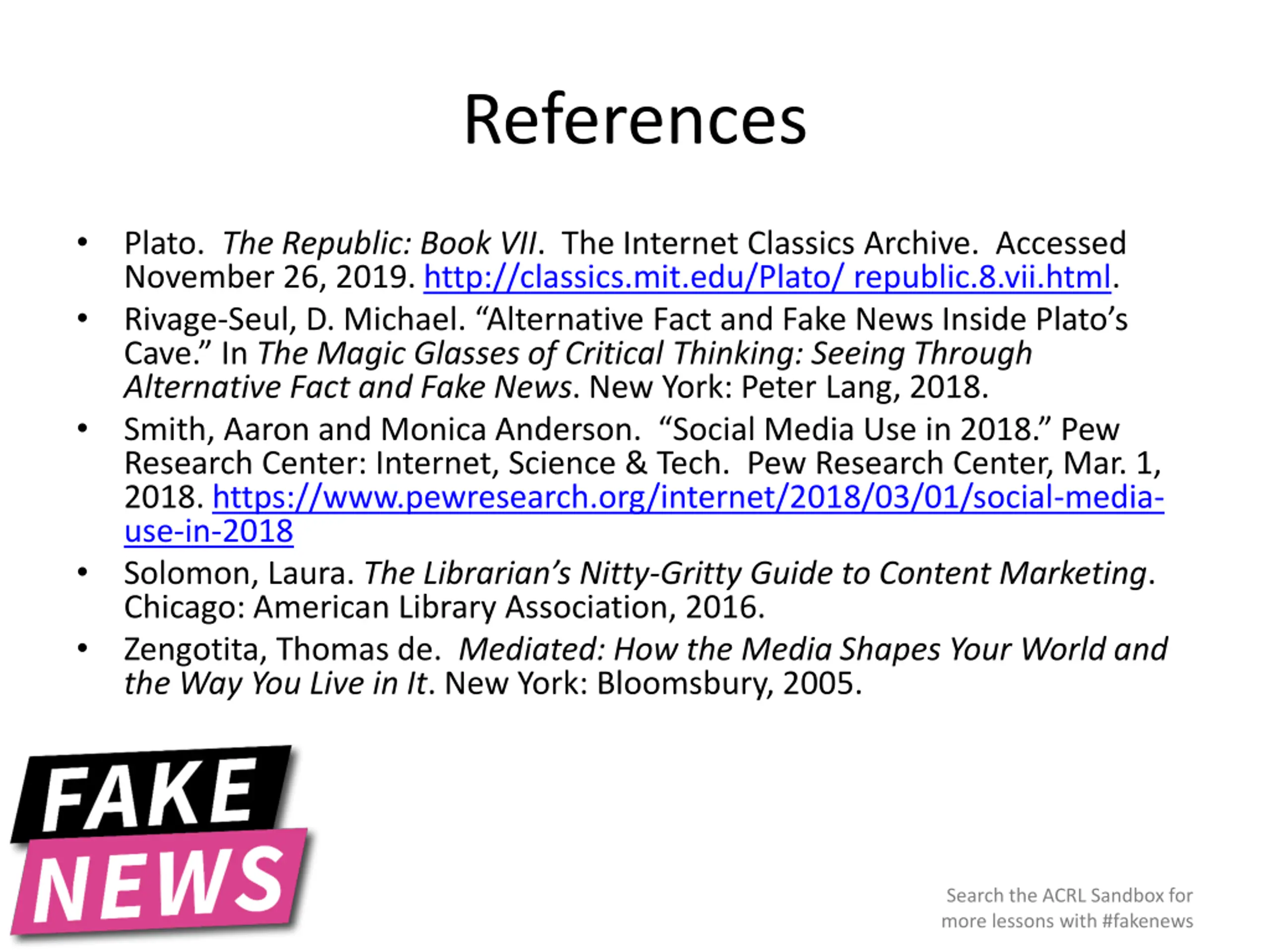 References Plato. The Republic: Book VII. The Internet Classics Archive. Accessed November 26, 2019. http://classics.mit.edu/Plato/ republic.8.vii.html. Rivage-Seul, D. Michael. Alternative Fact and Fake News Inside Plato s Cave. In The Magic Glasses of Critical Thinking: Seeing Through Alternative Fact and Fake News. New York: Peter Lang, 2018. Smith, Aaron and Monica Anderson. Social Media Use in 2018. Pew Research Center: Internet, Science & Tech. Pew Research Center, Mar. 1, 2018. https://www.pewresearch.org/internet/2018/03/01/social-media- use-in-2018 Solomon, Laura. The Librarian s Nitty-Gritty Guide to Content Marketing. Chicago: American Library Association, 2016. Zengotita, Thomas de. Mediated: How the Media Shapes Your World and the Way You Live in It. New York: Bloomsbury, 2005. Search the ACRL Sandbox for more lessons with #fakenews