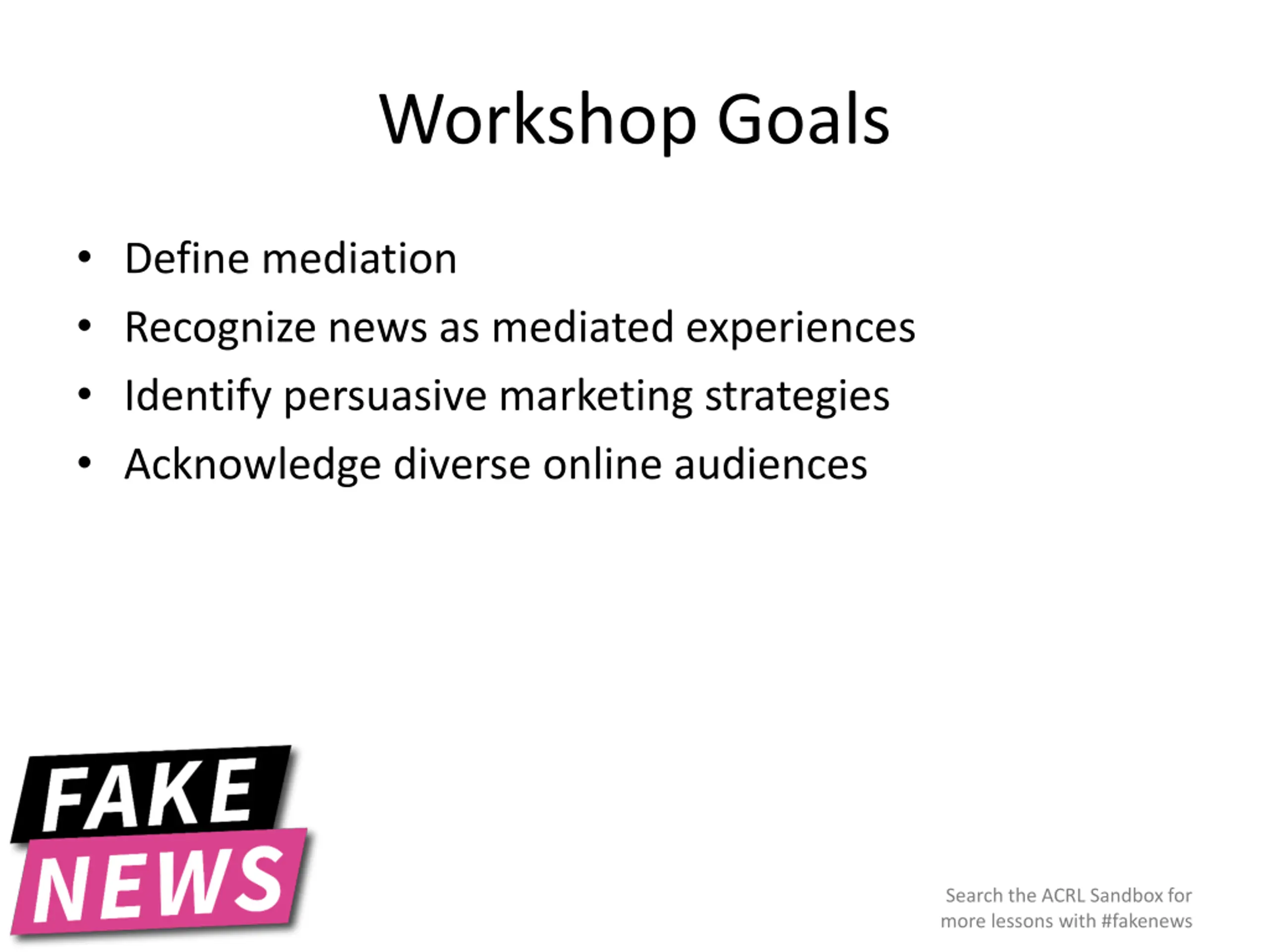 Workshop Goals Define mediation Recognize news as mediated experiences Identify persuasive marketing strategies Acknowledge diverse online audiences Search the ACRL Sandbox for more lessons with #fakenews