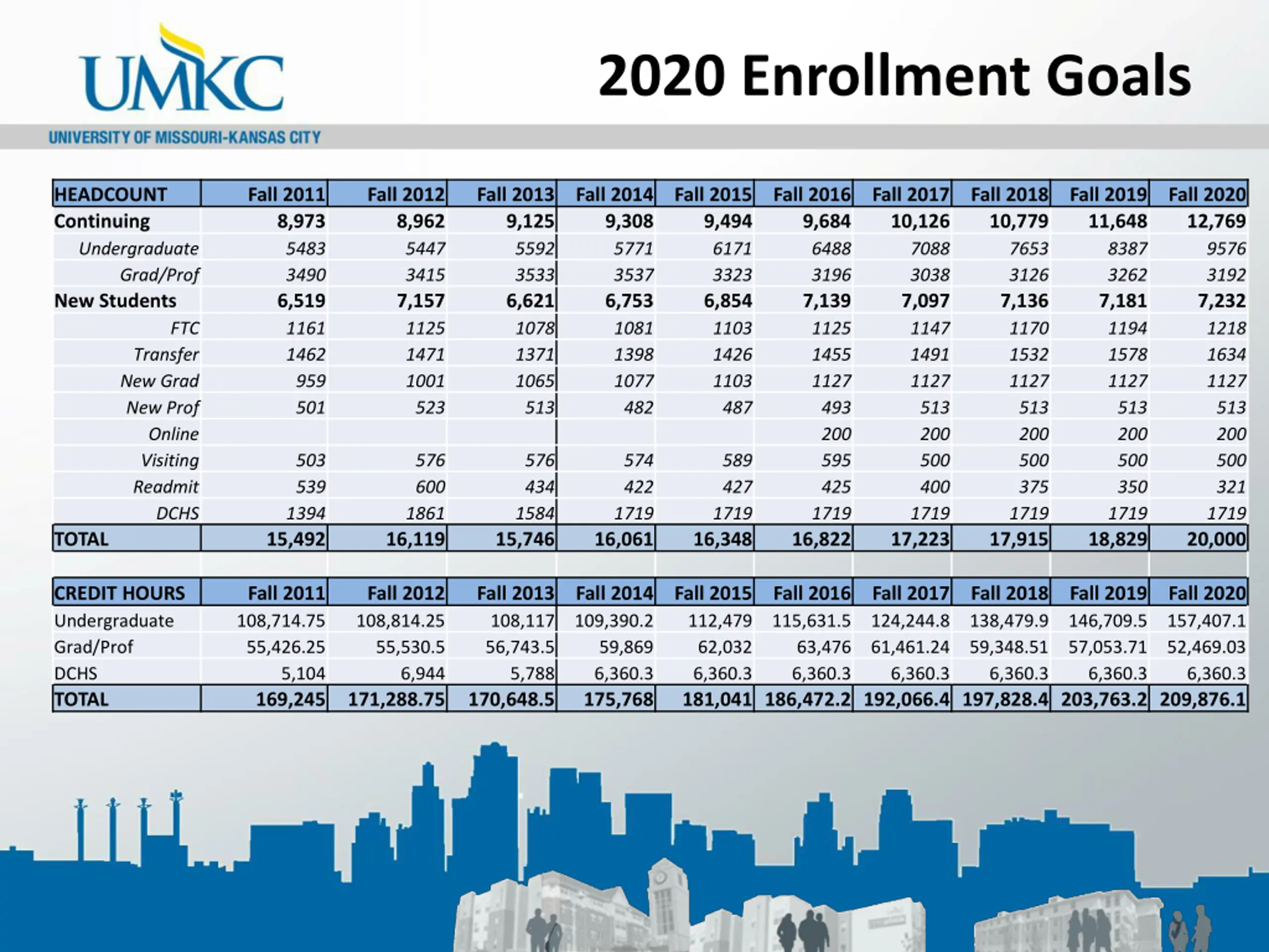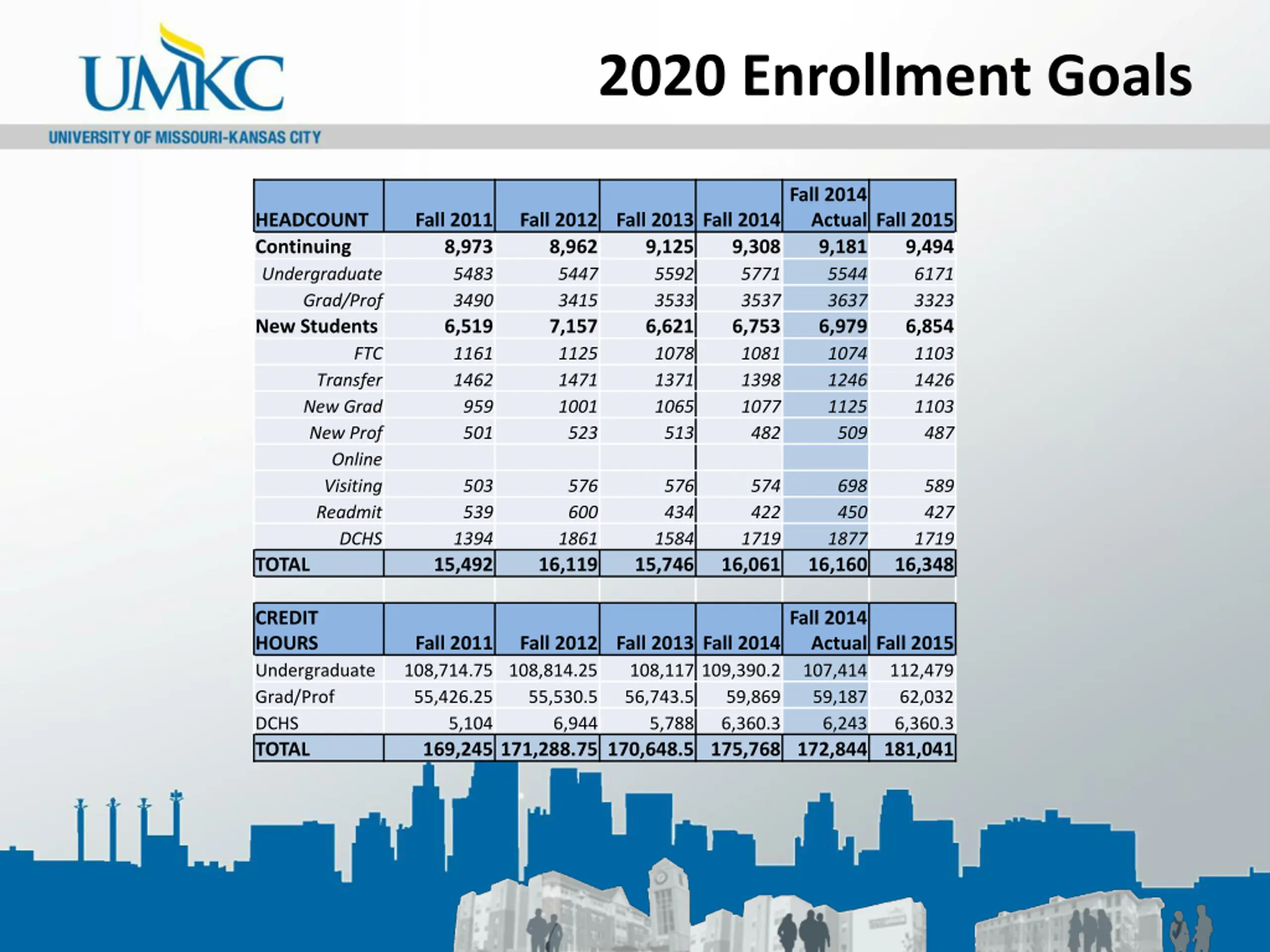 UMKC Goals UMKC Goals:Fall 2011 Fall 2013 By 2015 By 2020 Baseline 69.2% (FS11 cohort) 73.3% (FS12 cohort) Retention 80% 85% 43.1% (FS05 cohort) 51.3% (FS07 cohort) Graduation 50% 55%