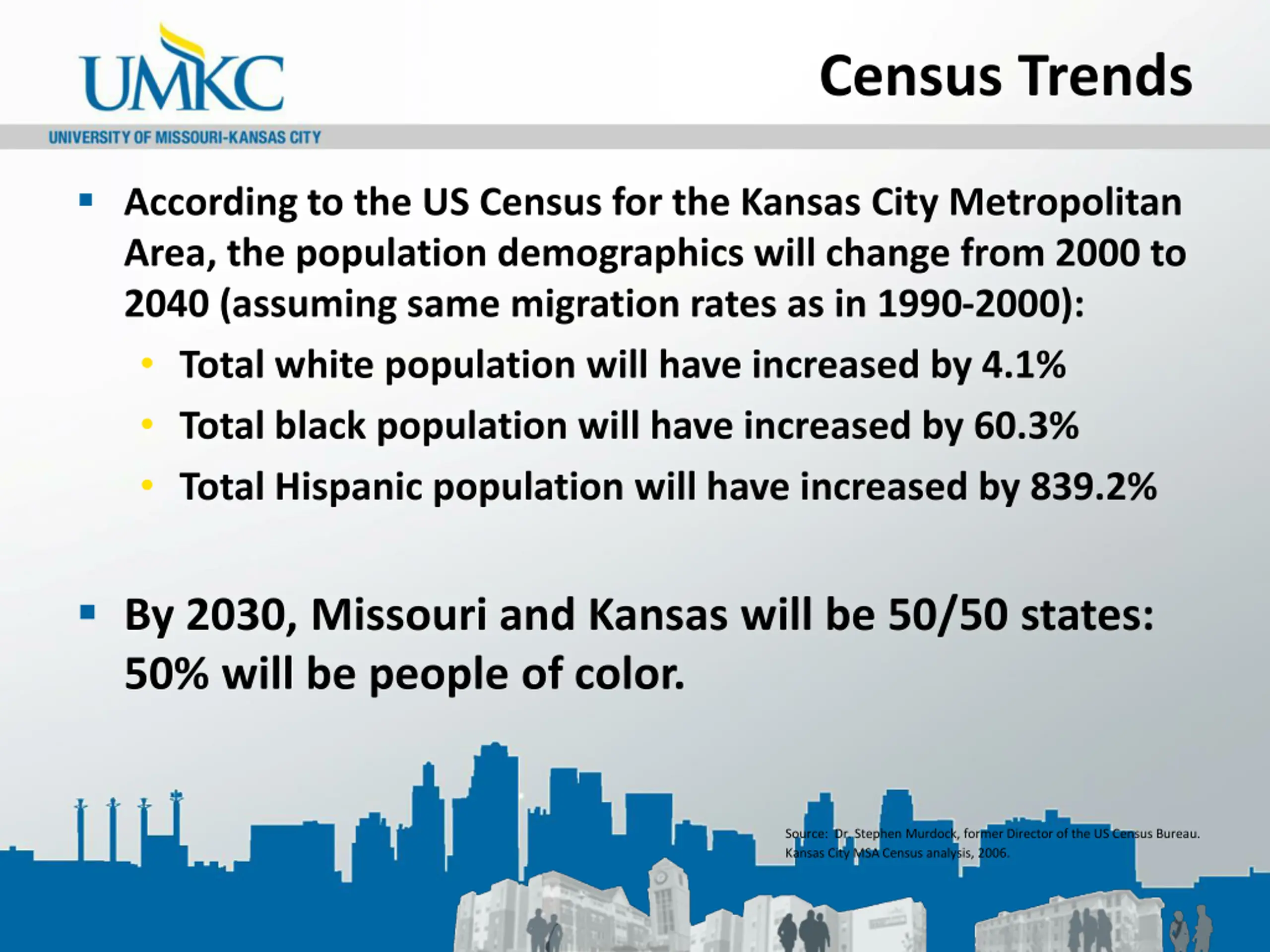 Census Trends According to the US Census for the Kansas City Metropolitan Area, the population demographics will change from 2000 to 2040 (assuming same migration rates as in 1990-2000): Total white population will have increased by 4.1% Total black population will have increased by 60.3% Total Hispanic population will have increased by 839.2% By 2030, Missouri and Kansas will be 50/50 states: 50% will be people of color. Source: Dr. Stephen Murdock, former Director of the US Census Bureau. Kansas City MSA Census analysis, 2006.