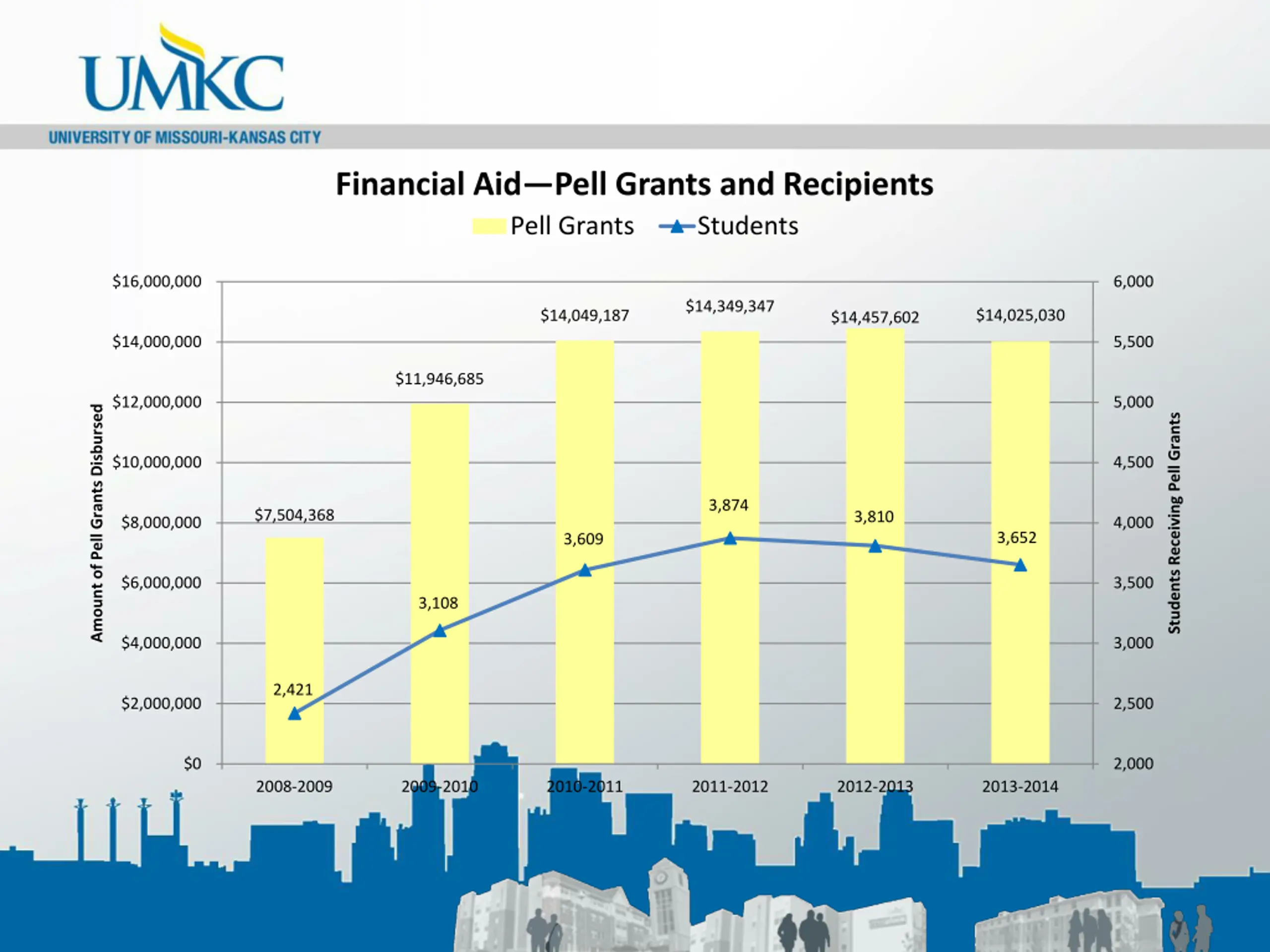 Financial AidPell Grants and Recipients Pell Grants Students $16,000,000 6,000 $14,349,347 $14,025,030 $14,049,187 $14,457,602 $14,000,000 5,500 $11,946,685 $12,000,000 5,000 Amount of Pell Grants Disbursed Students Receiving Pell Grants $10,000,000 4,500 3,874 $7,504,368 3,810 $8,000,000 4,000 3,652 3,609 $6,000,000 3,500 3,108 $4,000,000 3,000 2,421 $2,000,000 2,500 $0 2,000 2008-2009 2009-2010 2010-2011 2011-2012 2012-2013 2013-2014