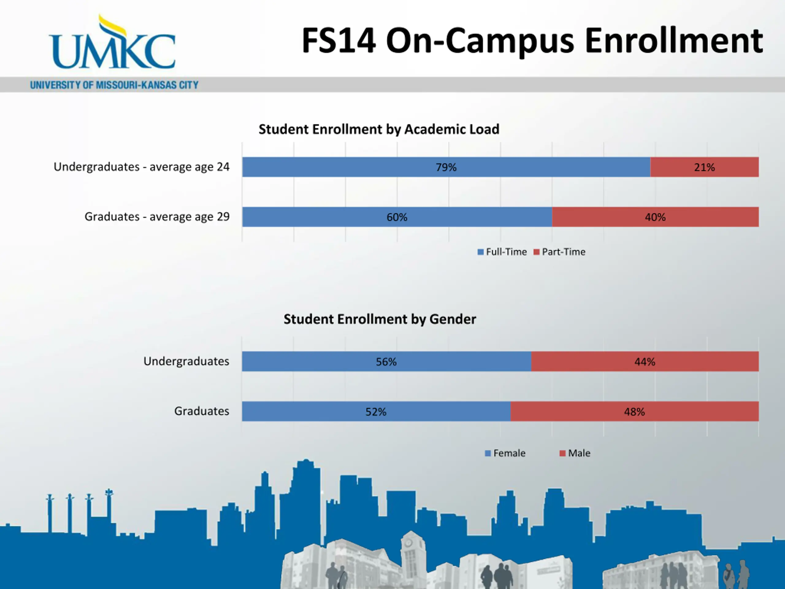 FS14 On-Campus Enrollment Geographic Origin 1,317 degree-seeking international students attend UMKC on student visas, representing 79 countries. 46.3% are from India 16.9% are from Saudi Arabia 13.4% are from China International, 9% Other States, 10% 2,102 students (representing 16.8% of on-campus undergraduate and non-professional graduate students) receive the Kansas Metro Rate. Undergraduate and non-Professional Graduate students who are residents of 11 contiguous Kansas Counties are charged a tuition rate equal to the Missouri resident rate. Kansas Metro Rate counties are: Atchison, Douglas, Franklin, Jackson, Jefferson, Johnson, Leavenworth, Miami, Osage, Shawnee, and Wyandotte. Kansas, 19% Missouri, 62%