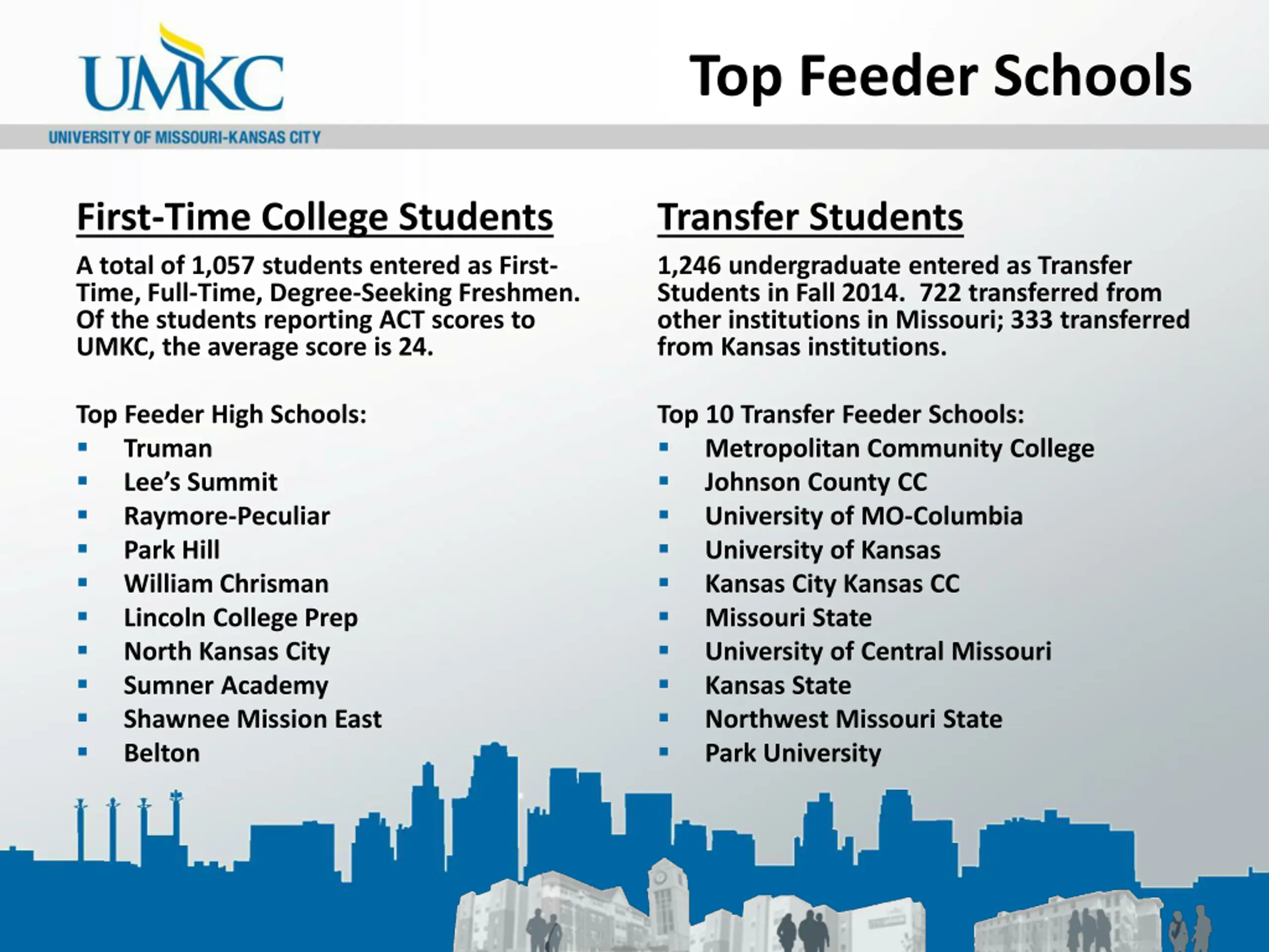 Top Feeder Schools First-Time College Students A total of 1,057 students entered as First- Time, Full-Time, Degree-Seeking Freshmen. Of the students reporting ACT scores to UMKC, the average score is 24. Transfer Students 1,246 undergraduate entered as Transfer Students in Fall 2014. 722 transferred from other institutions in Missouri; 333 transferred from Kansas institutions. Top Feeder High Schools: Truman Lee s Summit Raymore-Peculiar Park Hill William Chrisman Lincoln College Prep North Kansas City Sumner Academy Shawnee Mission East Belton Top 10 Transfer Feeder Schools: Metropolitan Community College Johnson County CC University of MO-Columbia University of Kansas Kansas City Kansas CC Missouri State University of Central Missouri Kansas State Northwest Missouri State Park University