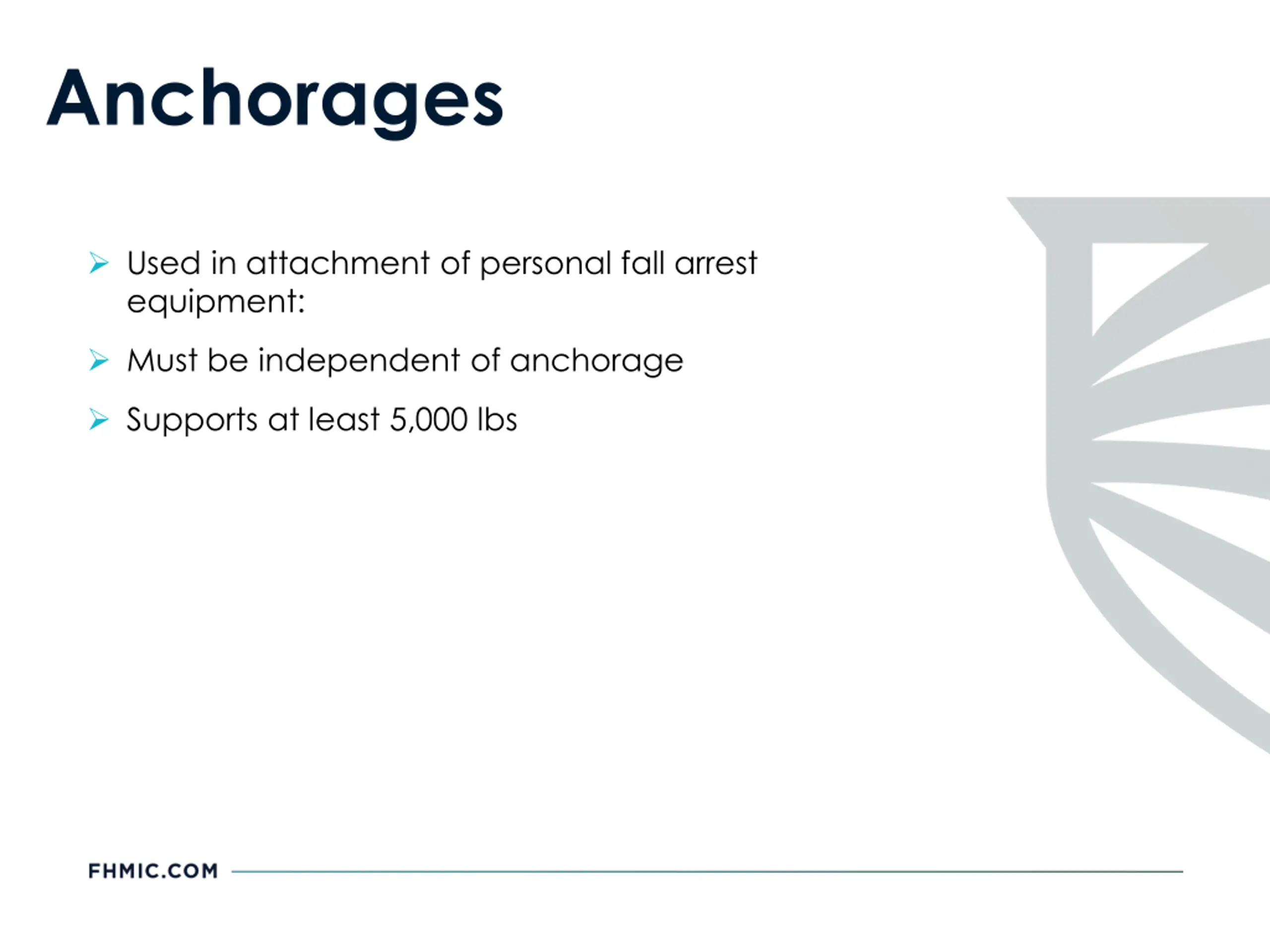 Anchorages Used in attachment of personal fall arrest equipment: Must be independent of anchorage Supports at least 5,000 lbs