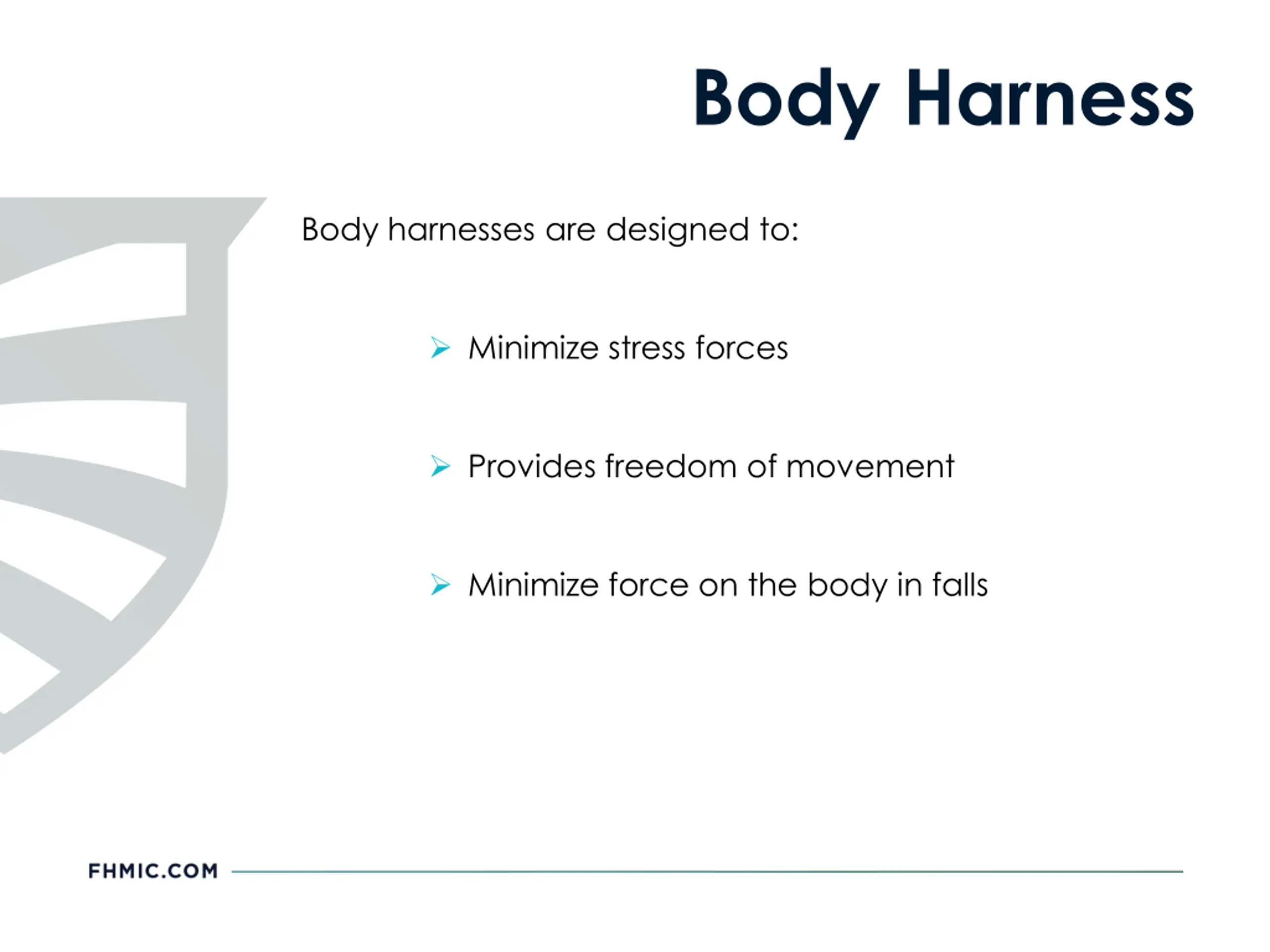Body Harness Body harnesses are designed to: Minimize stress forces Provides freedom of movement Minimize force on the body in falls