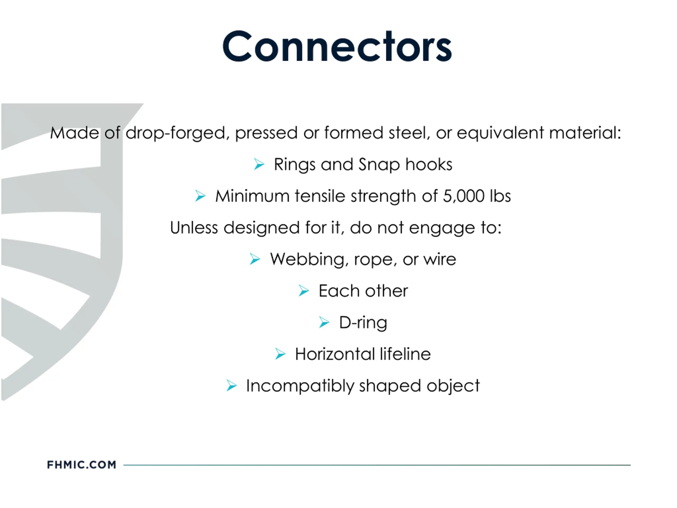 Connectors Made of drop-forged, pressed or formed steel, or equivalent material: Rings and Snap hooks Minimum tensile strength of 5,000 lbs Unless designed for it, do not engage to: Webbing, rope, or wire Each other D-ring Horizontal lifeline Incompatibly shaped object