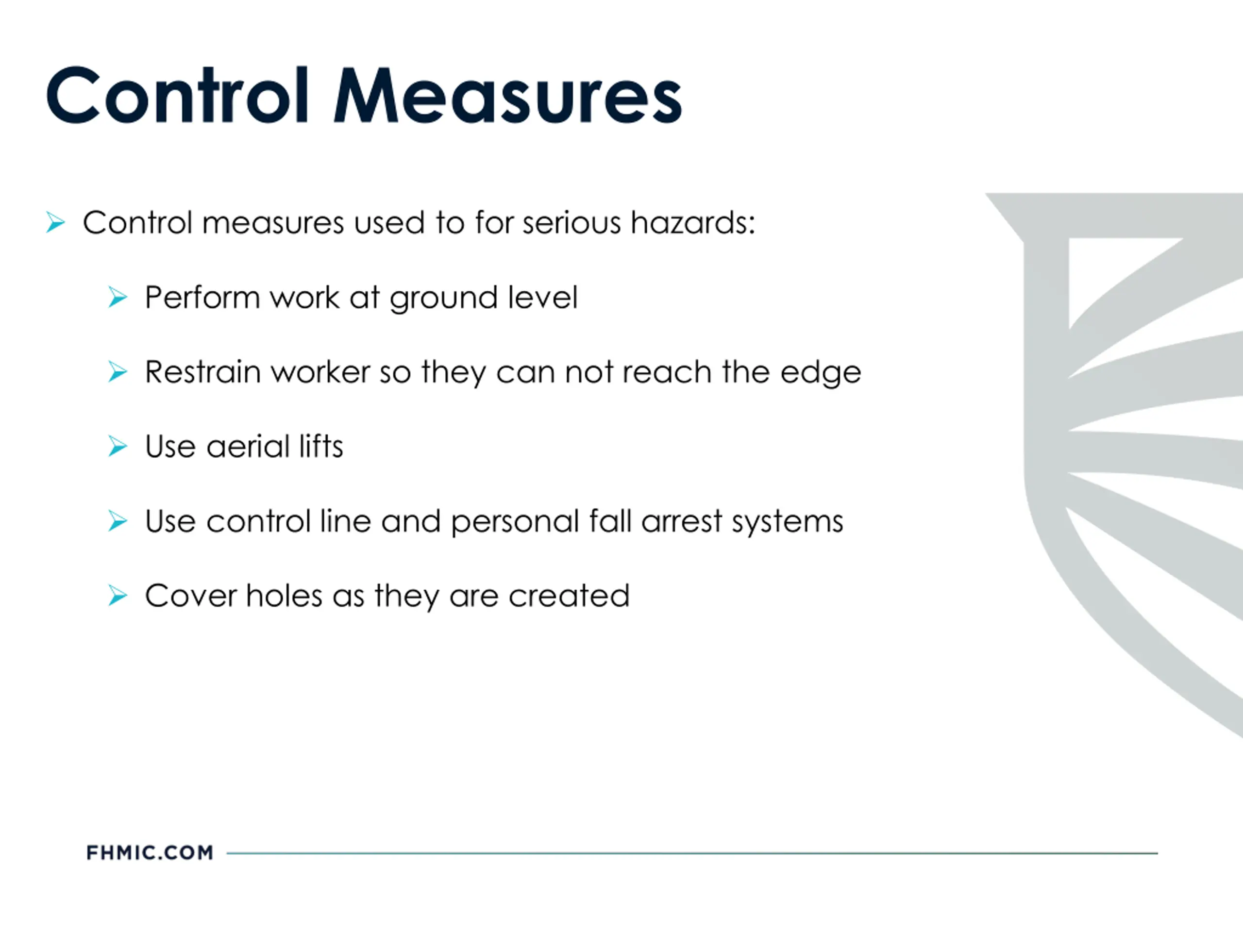 Control Measures Control measures used to for serious hazards: Perform work at ground level Restrain worker so they can not reach the edge Use aerial lifts Use control line and personal fall arrest systems Cover holes as they are created