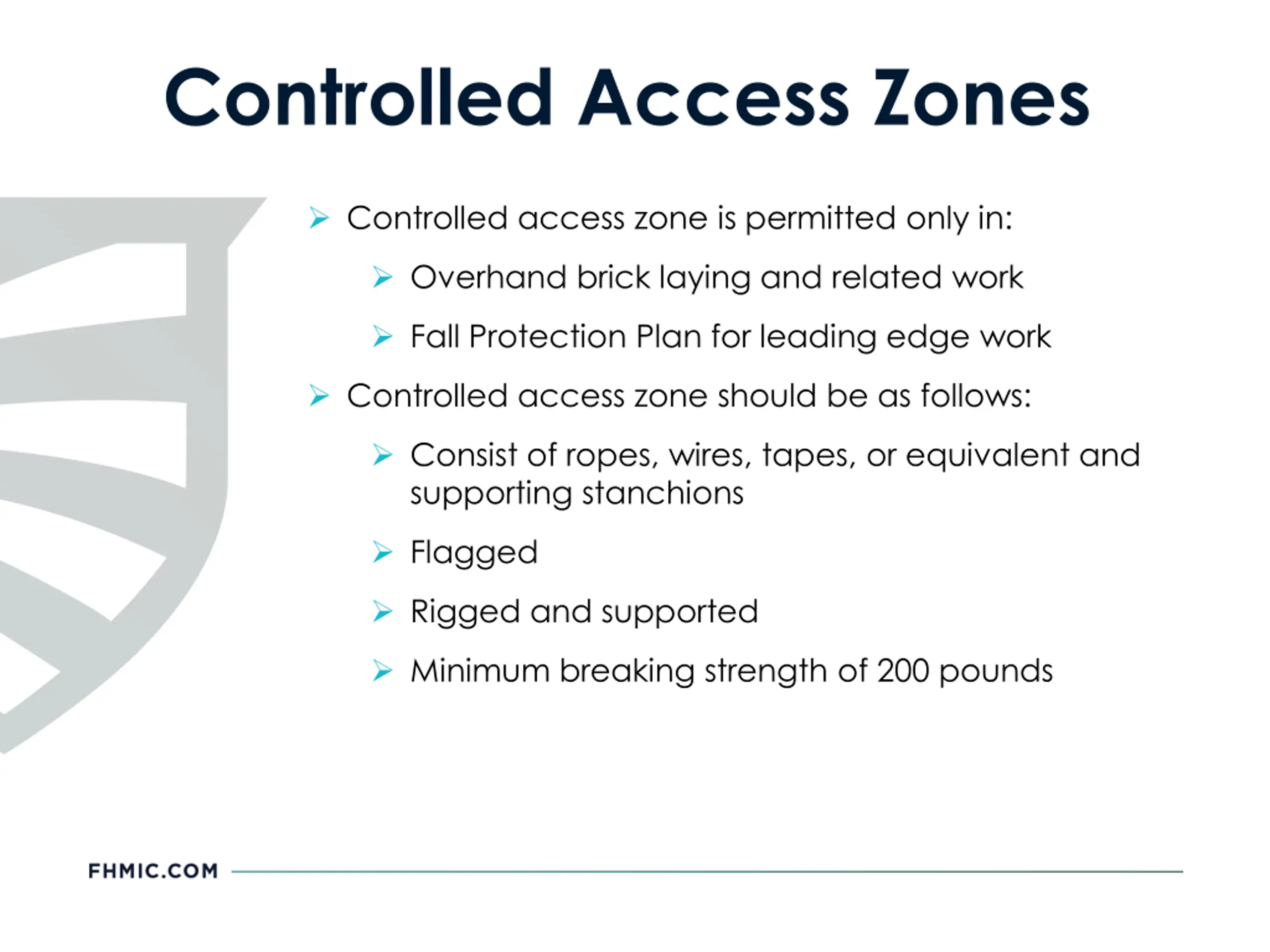 Controlled Access Zones Controlled access zone is permitted only in: Overhand brick laying and related work Fall Protection Plan for leading edge work Controlled access zone should be as follows: Consist of ropes, wires, tapes, or equivalent and supporting stanchions Flagged Rigged and supported Minimum breaking strength of 200 pounds