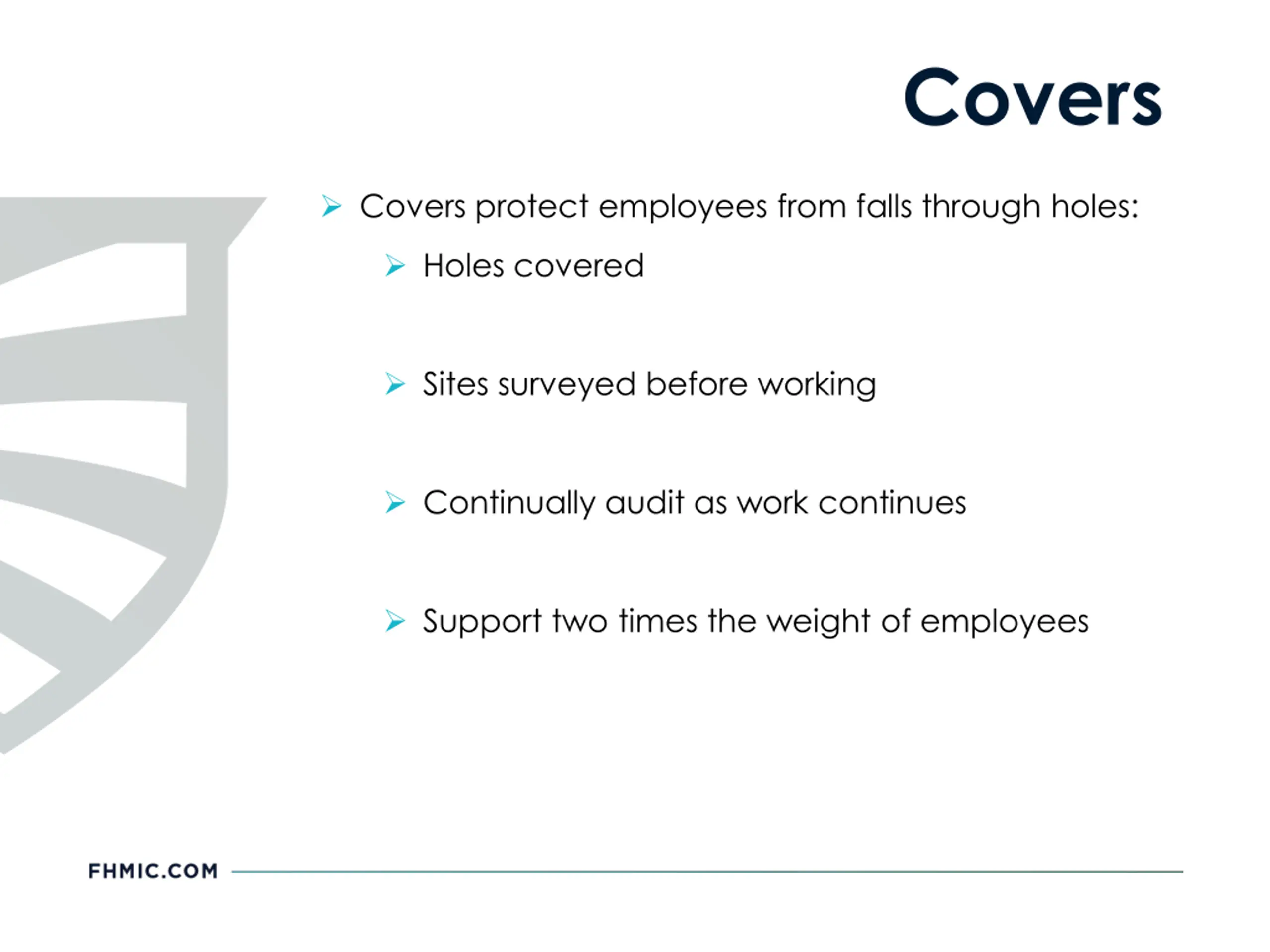 Covers Covers protect employees from falls through holes: Holes covered Sites surveyed before working Continually audit as work continues Support two times the weight of employees