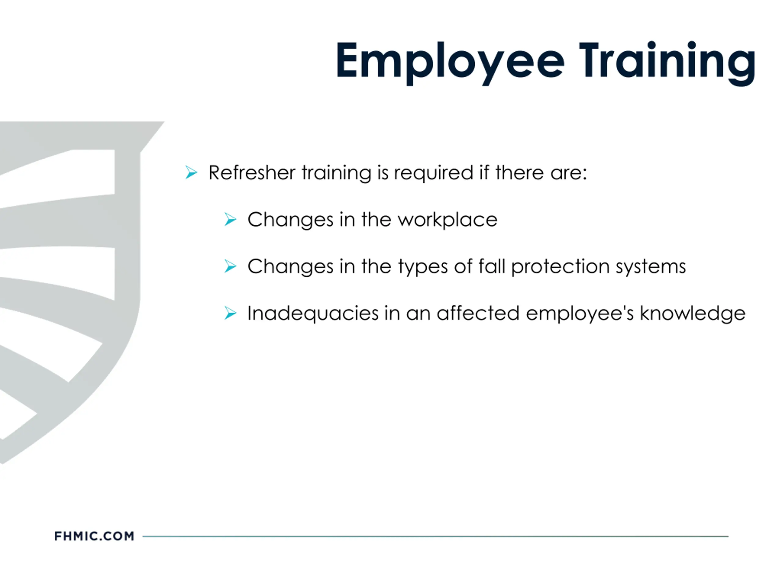 Employee Training Refresher training is required if there are: Changes in the workplace Changes in the types of fall protection systems Inadequacies in an affected employee's knowledge