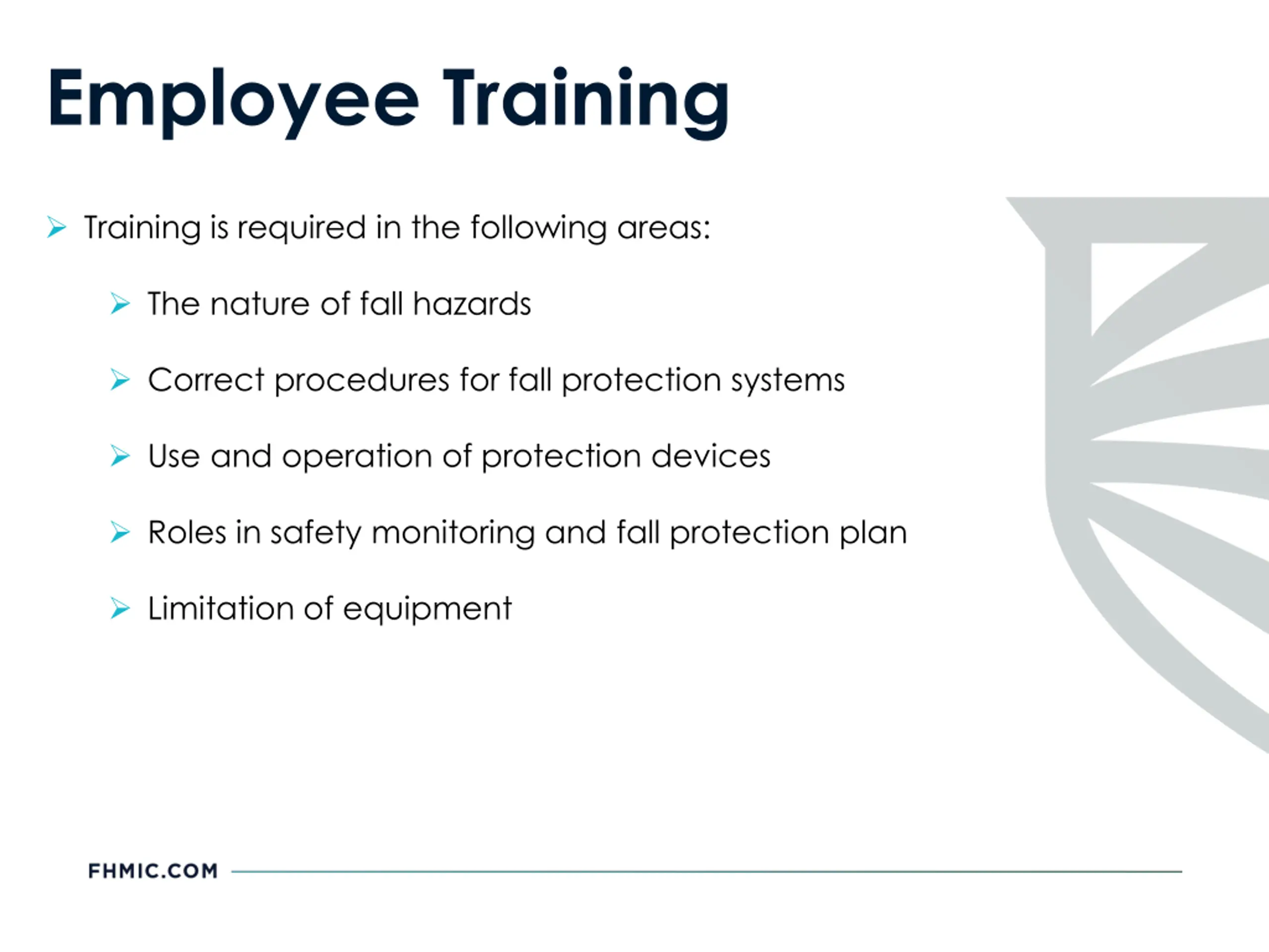 Employee Training Training is required in the following areas: The nature of fall hazards Correct procedures for fall protection systems Use and operation of protection devices Roles in safety monitoring and fall protection plan Limitation of equipment