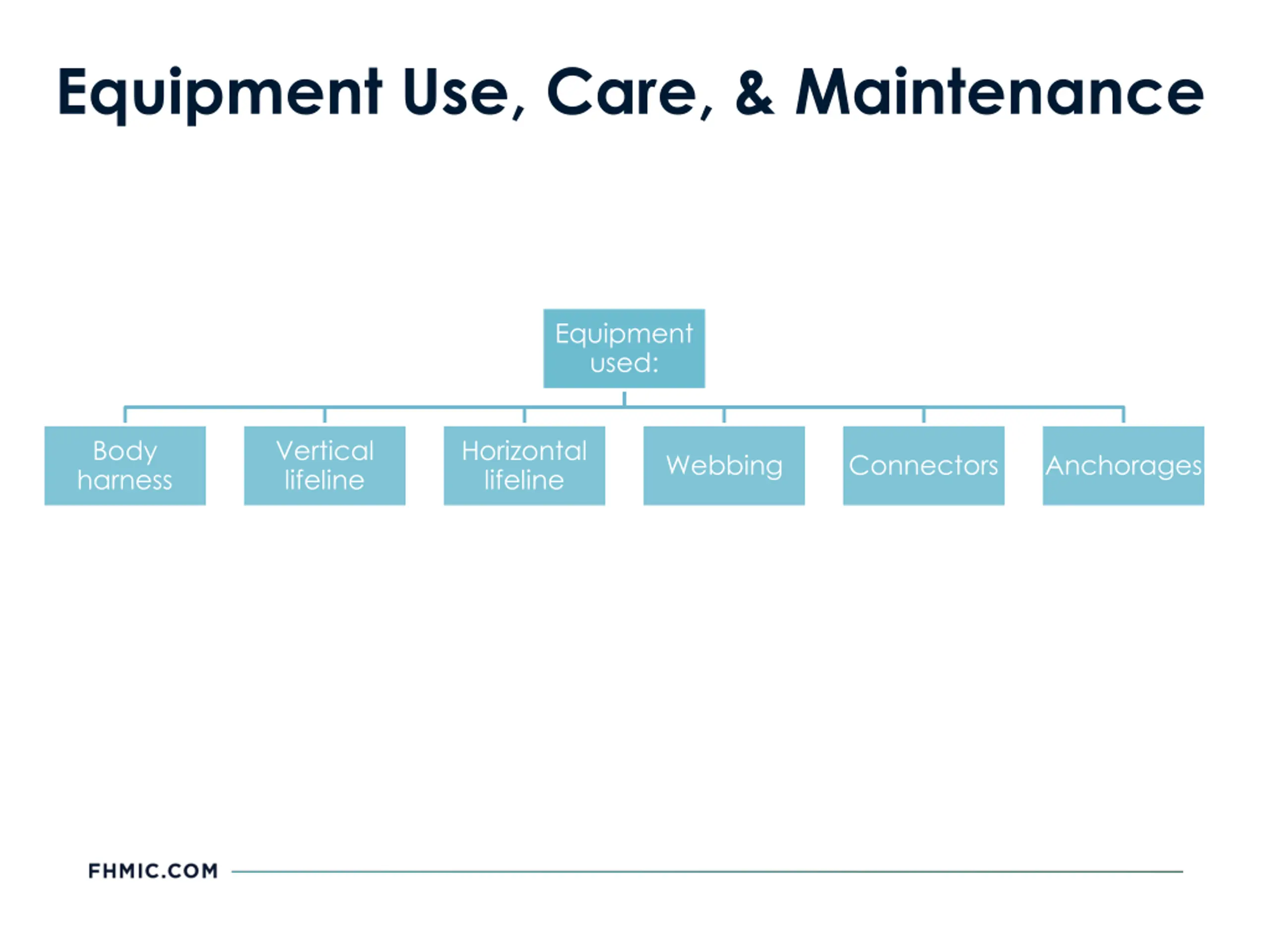 Equipment Use, Care, & Maintenance Equipment used: Body harness Vertical lifeline Horizontal lifeline Webbing Connectors Anchorages