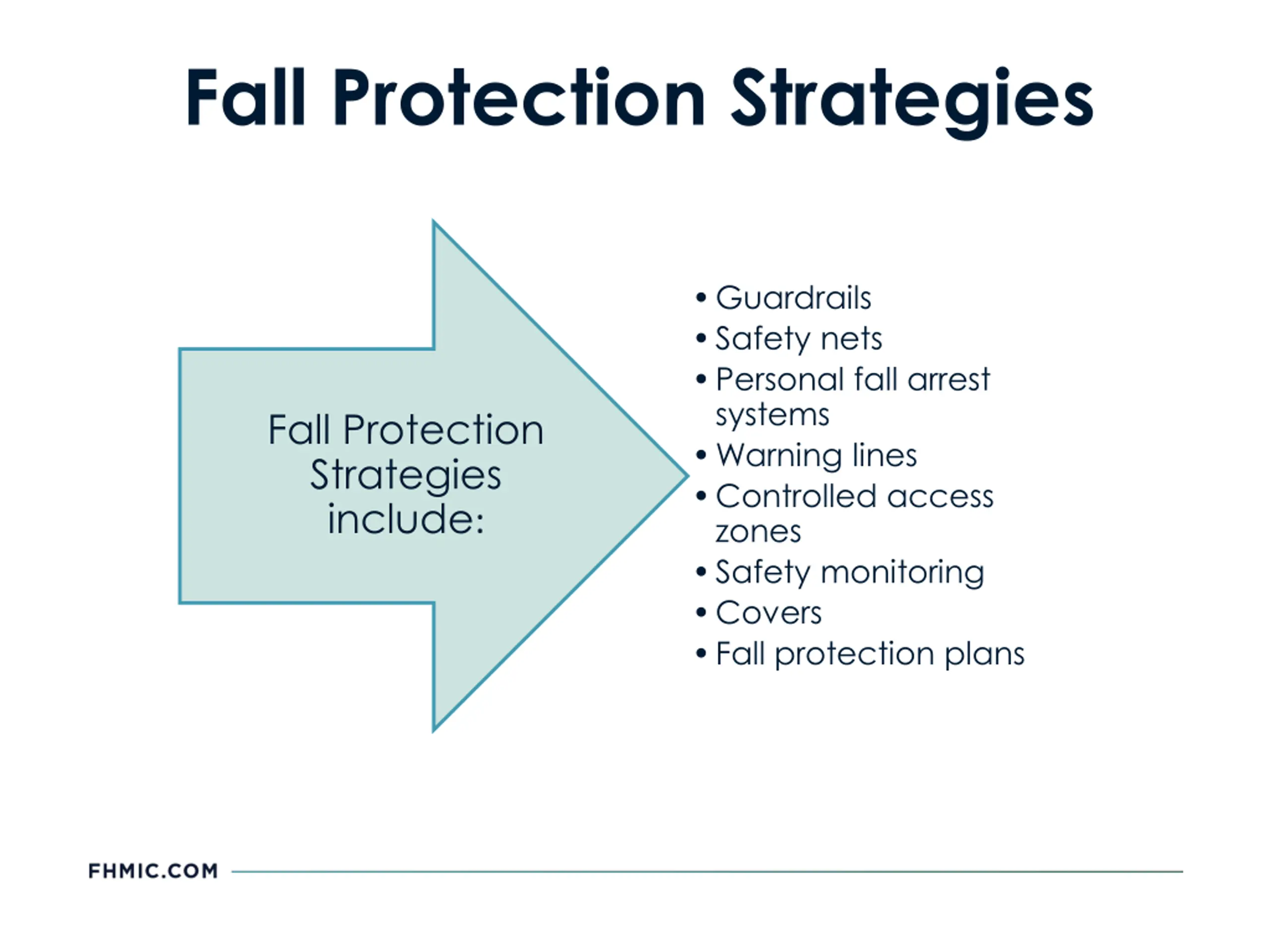 Fall Protection Strategies Guardrails Safety nets Personal fall arrest systems Warning lines Controlled access zones Safety monitoring Covers Fall protection plans Fall Protection Strategies include: