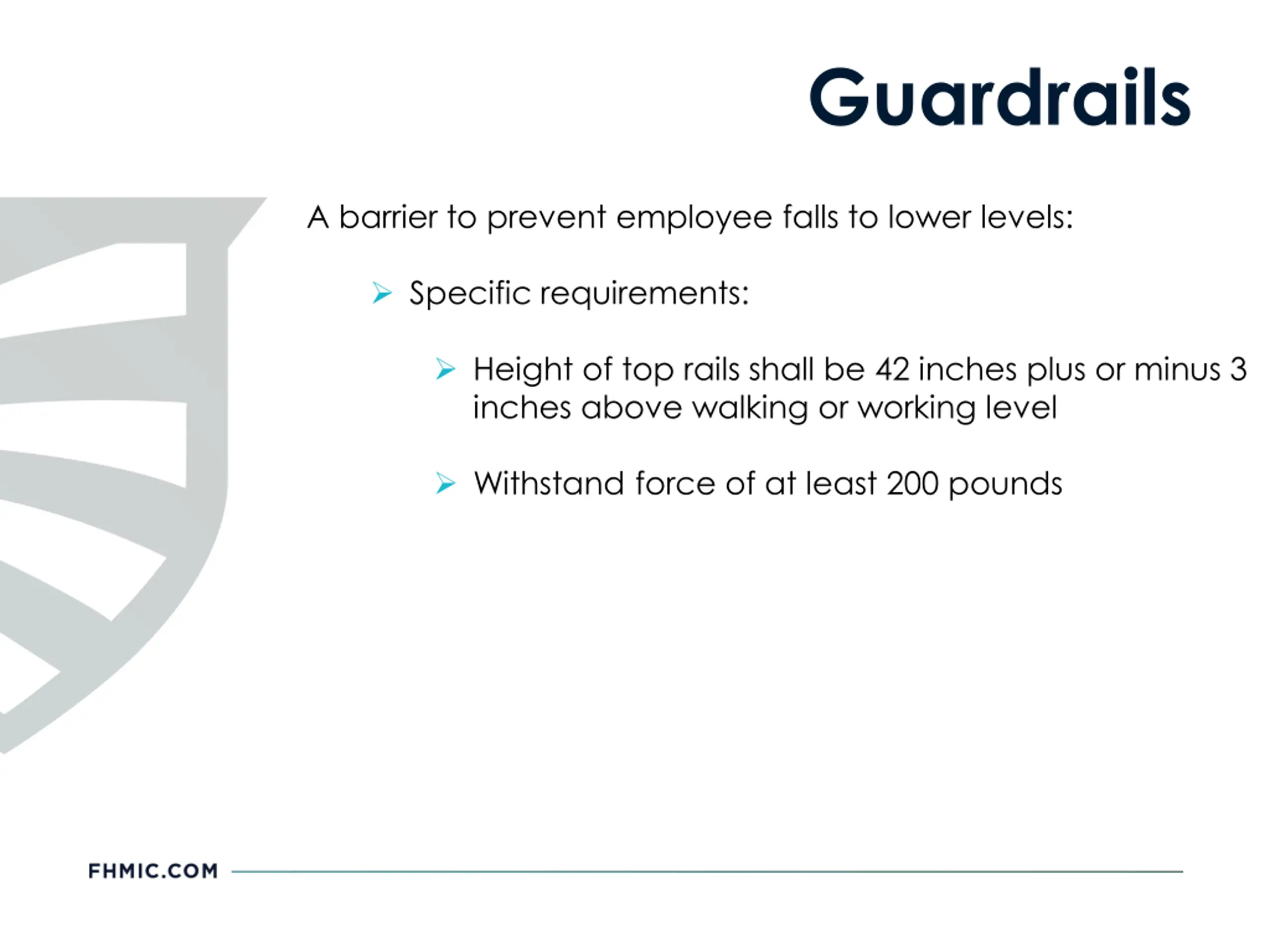 Guardrails A barrier to prevent employee falls to lower levels: Specific requirements: Height of top rails shall be 42 inches plus or minus 3 inches above walking or working level Withstand force of at least 200 pounds