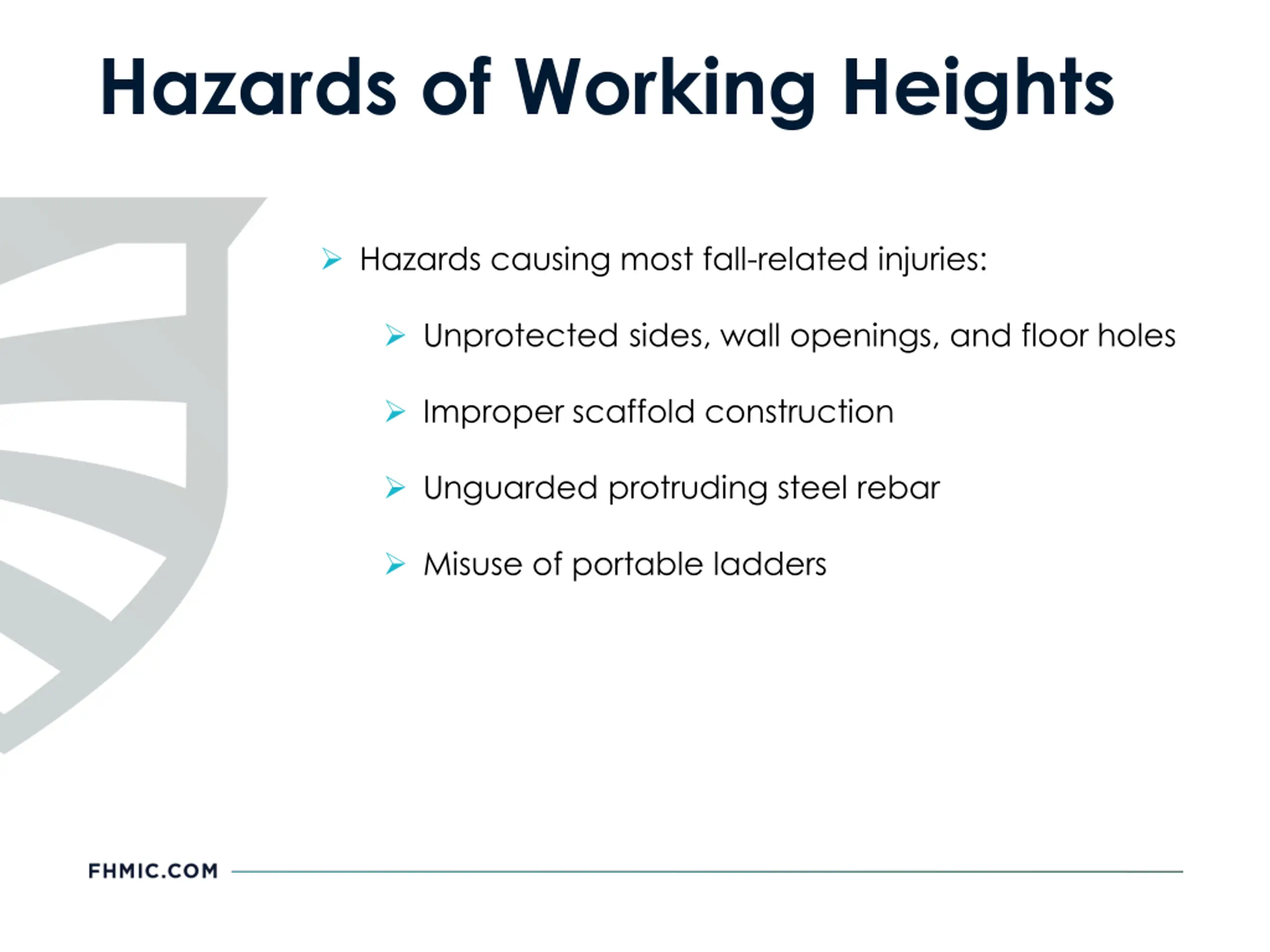 Hazards of Working Heights Hazards causing most fall-related injuries: Unprotected sides, wall openings, and floor holes Improper scaffold construction Unguarded protruding steel rebar Misuse of portable ladders